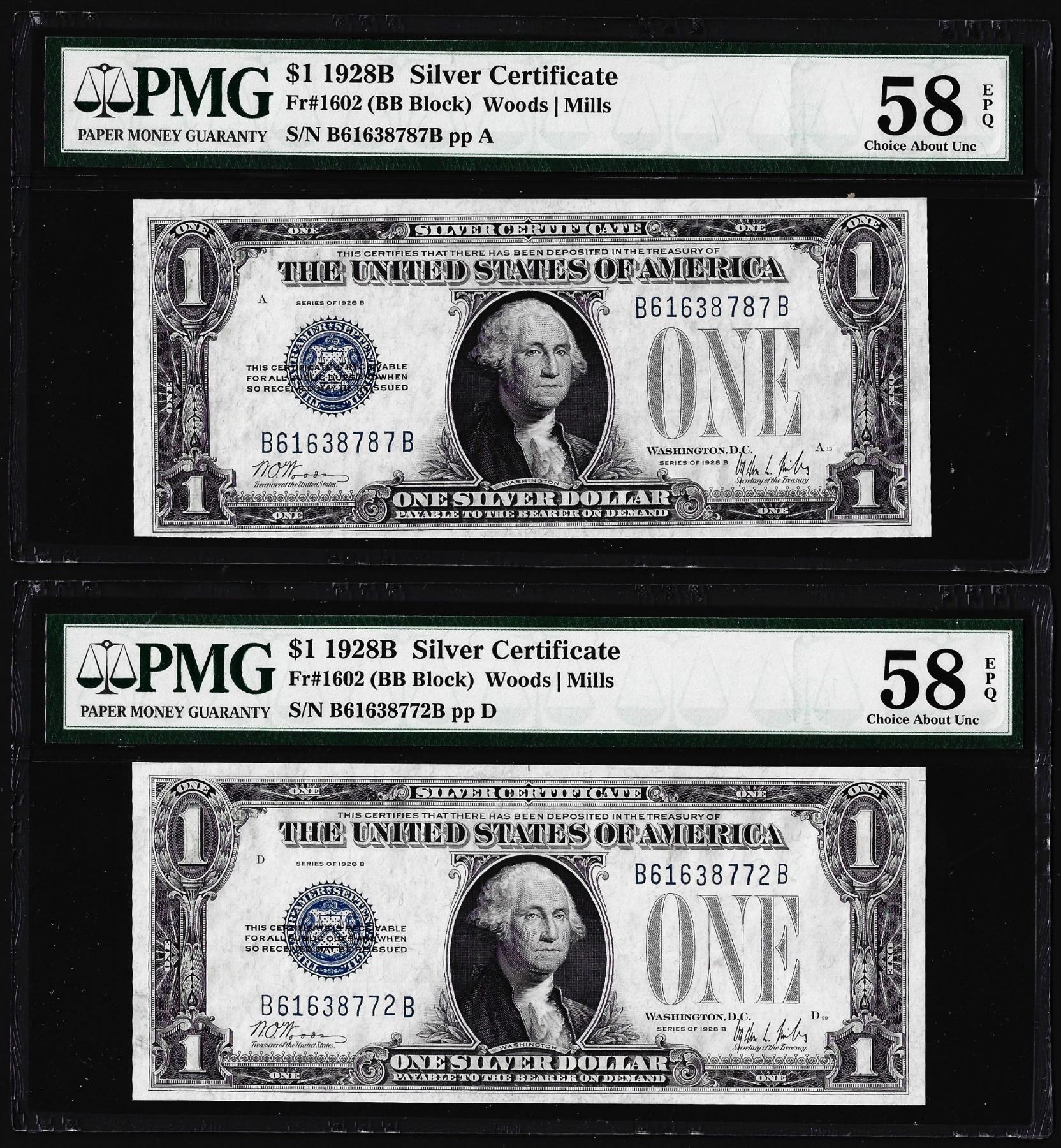 Lot of (2) 1928B $1 Silver Certificate Notes Fr.1602 PMG About Uncirculated 58EPQ