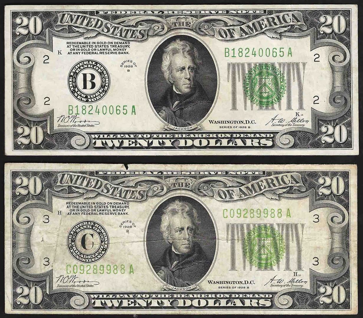 One Lot of (2) 1928B $20 Federal Reserve Notes.
