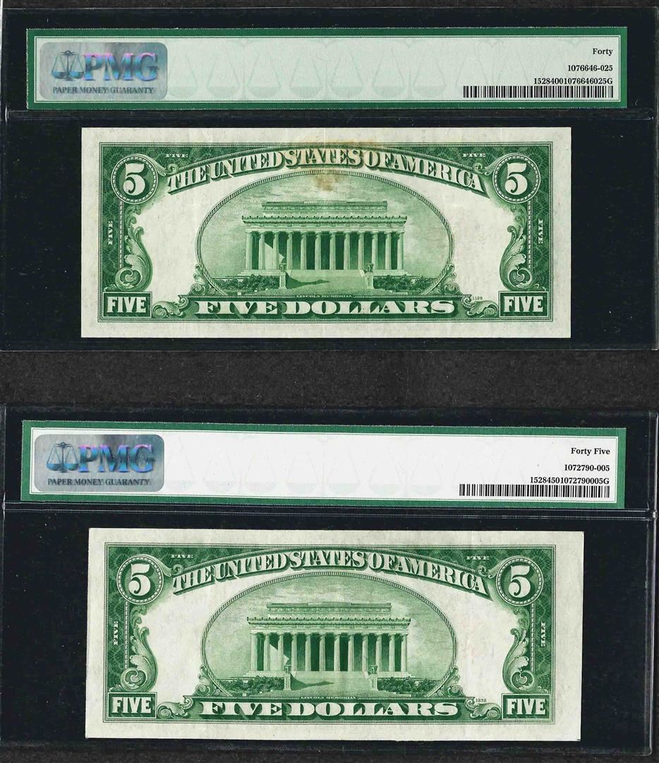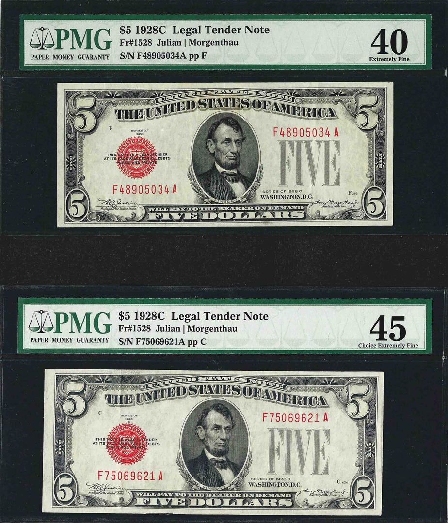 One Lot of (2) 1928C $5 Legal Tender Notes Fr.1528 PMG Extremely Fine 40/45. PMG Certified.