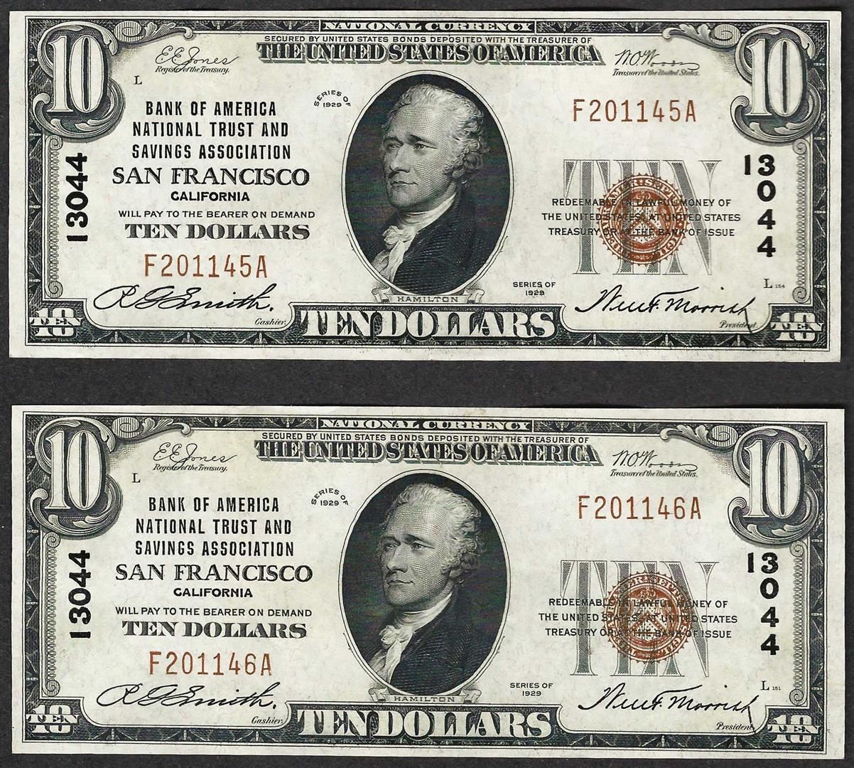 One Lot of (2) 1929 $10 Bank of America San Francisco National Currency Note CH# 13044.
