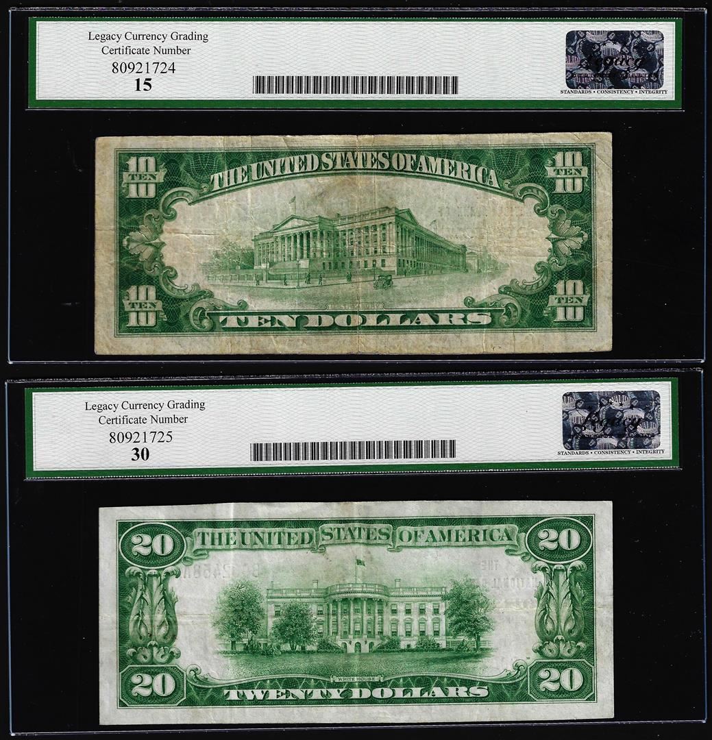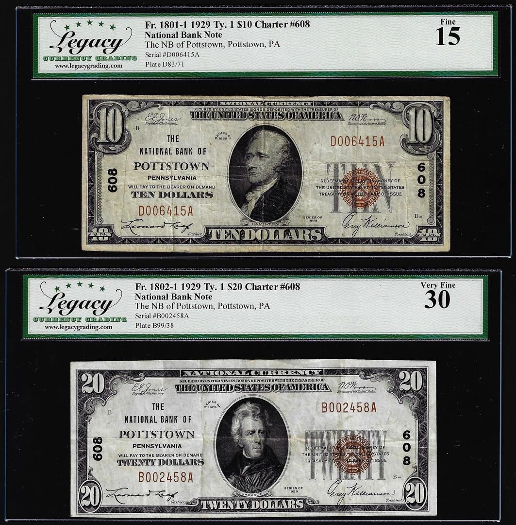 One Lot of (2) 1929 $10 Posttown, PA CH# 608 National Currency Note Legacy Fine 15/ VF30. Legacy Graded.