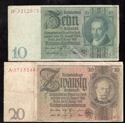 Lot 365; Lot of 2 - 1929 Germany Reichsmark Banknotes, 10 Reichsmark, 20 Reichmark