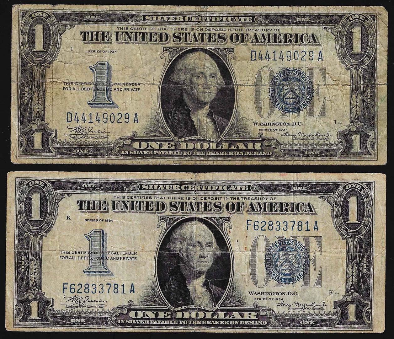 One Lot of (2) 1934 $1 Silver Certificate Funnyback Notes.
