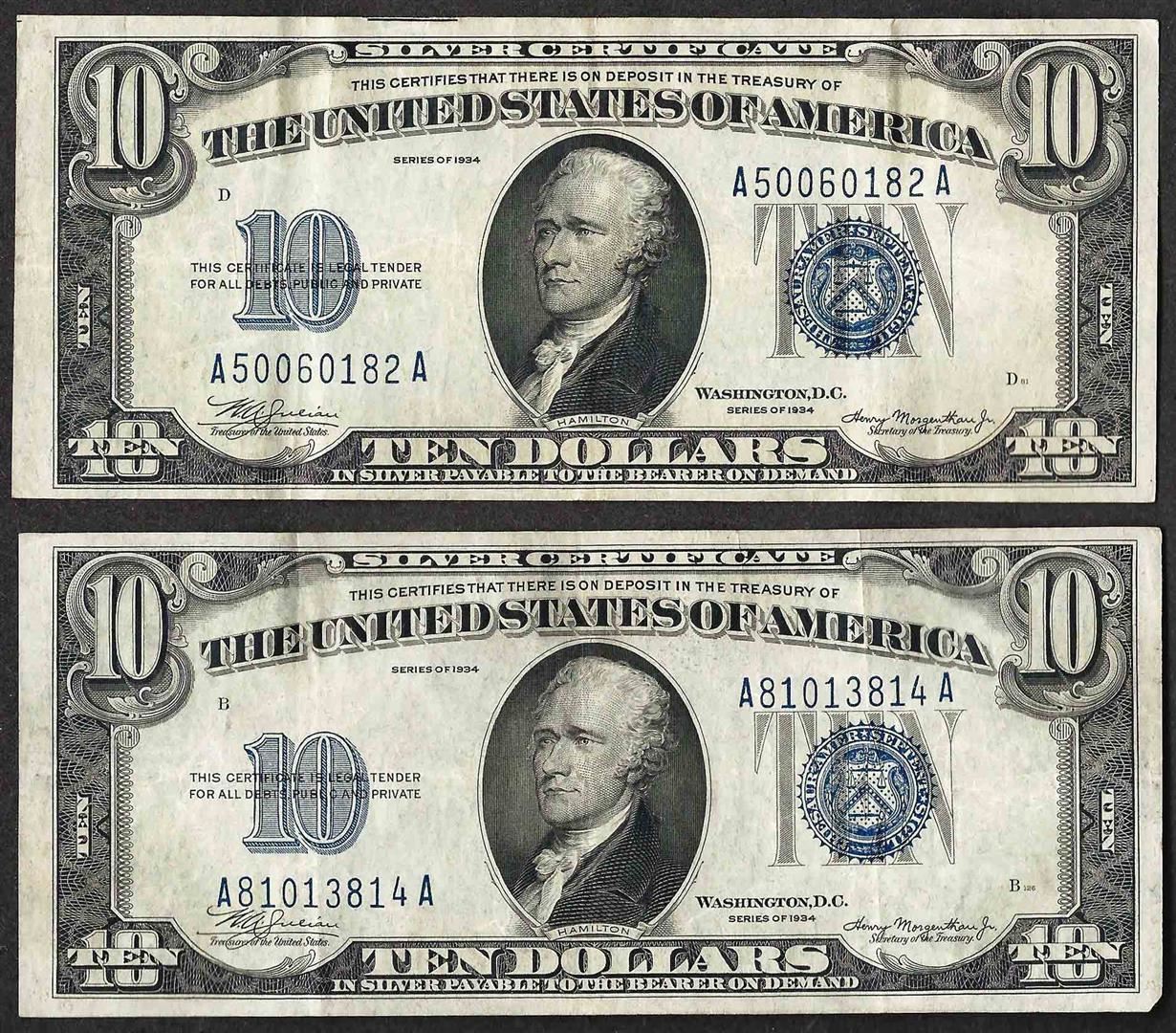 One Lot of (2) 1934 $10 Silver Certificate Notes.
