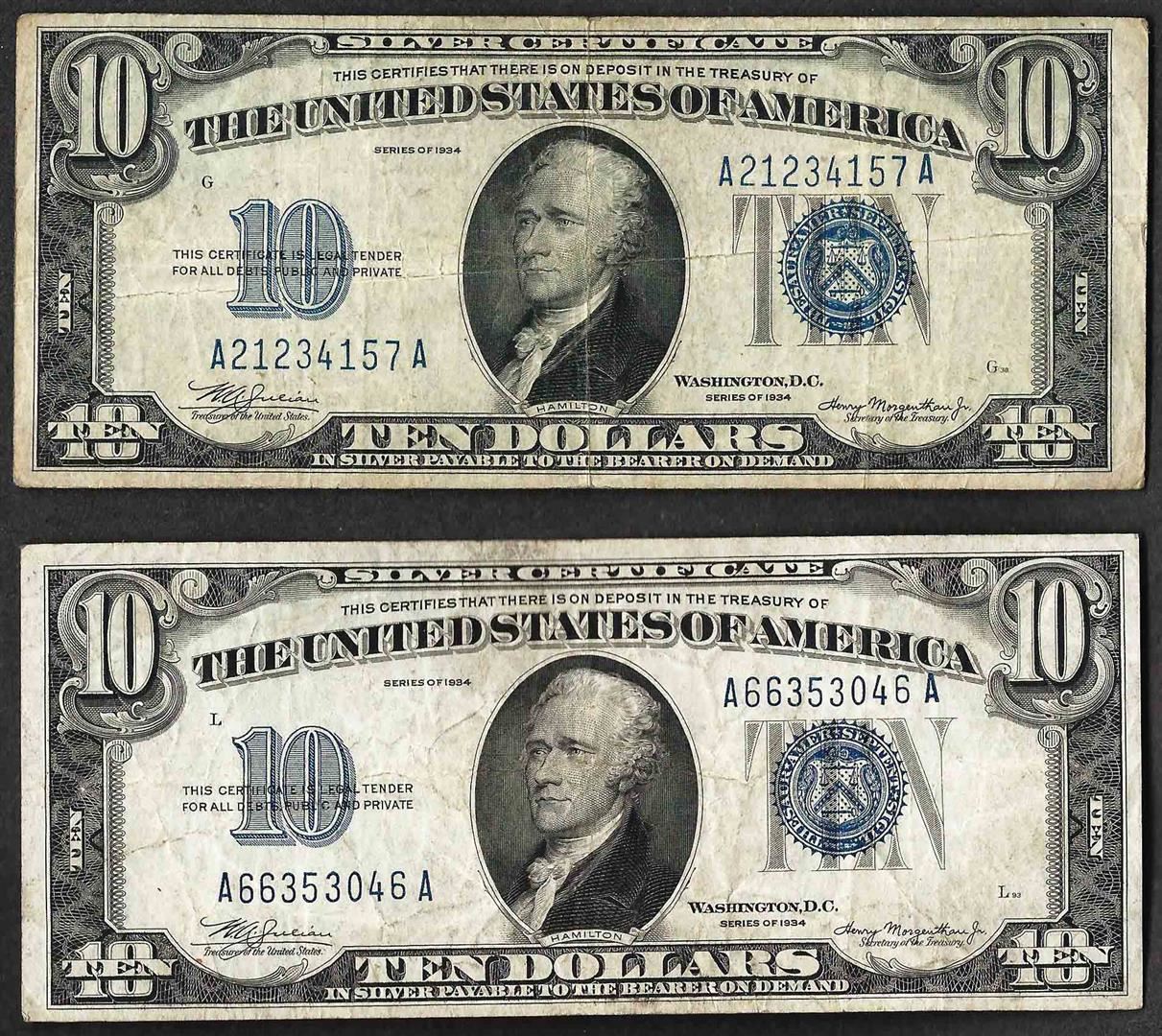 One Lot of (2) 1934 $10 Silver Certificate Notes.