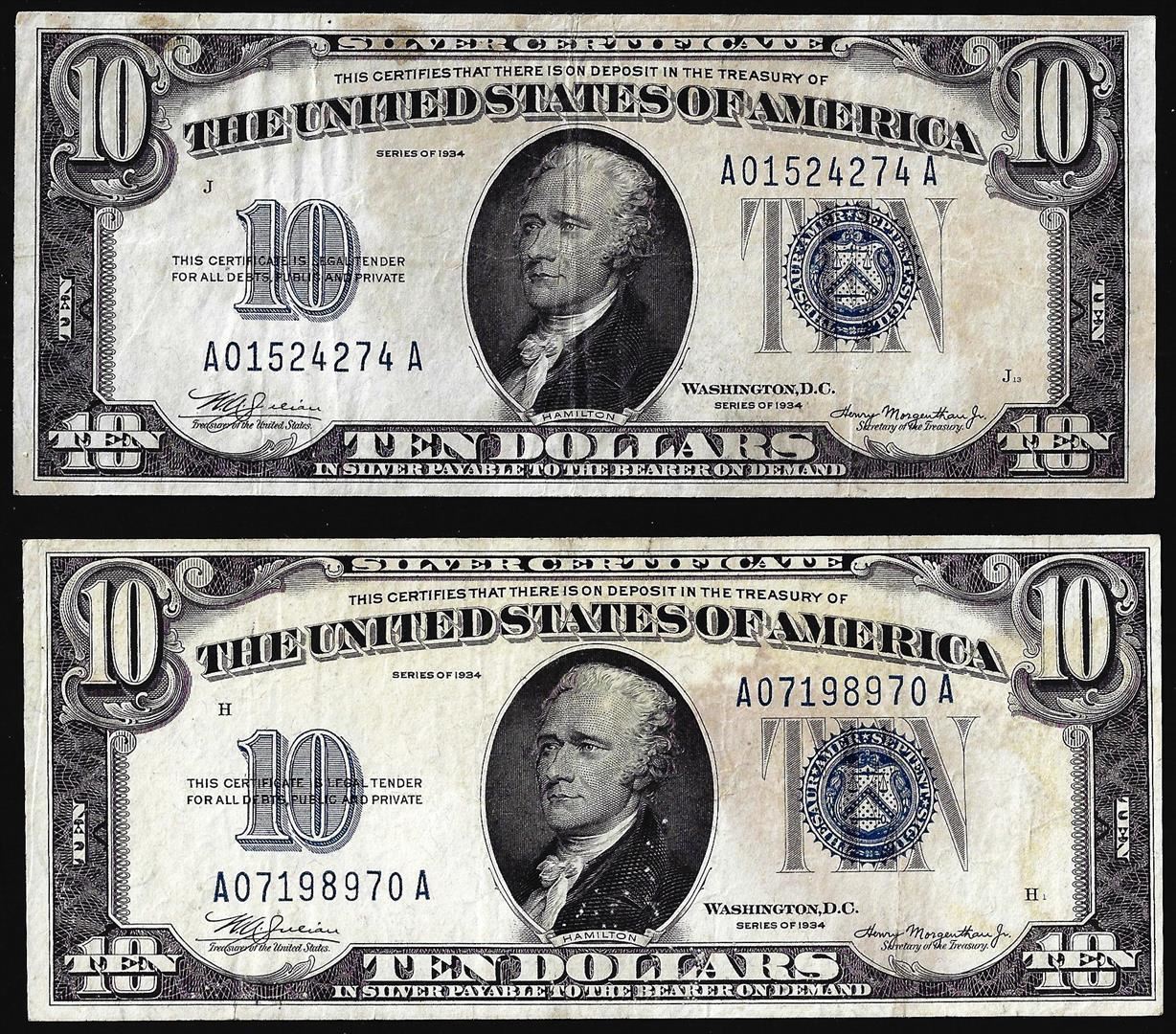 One Lot of (2) 1934 $10 Silver Certificate Notes.