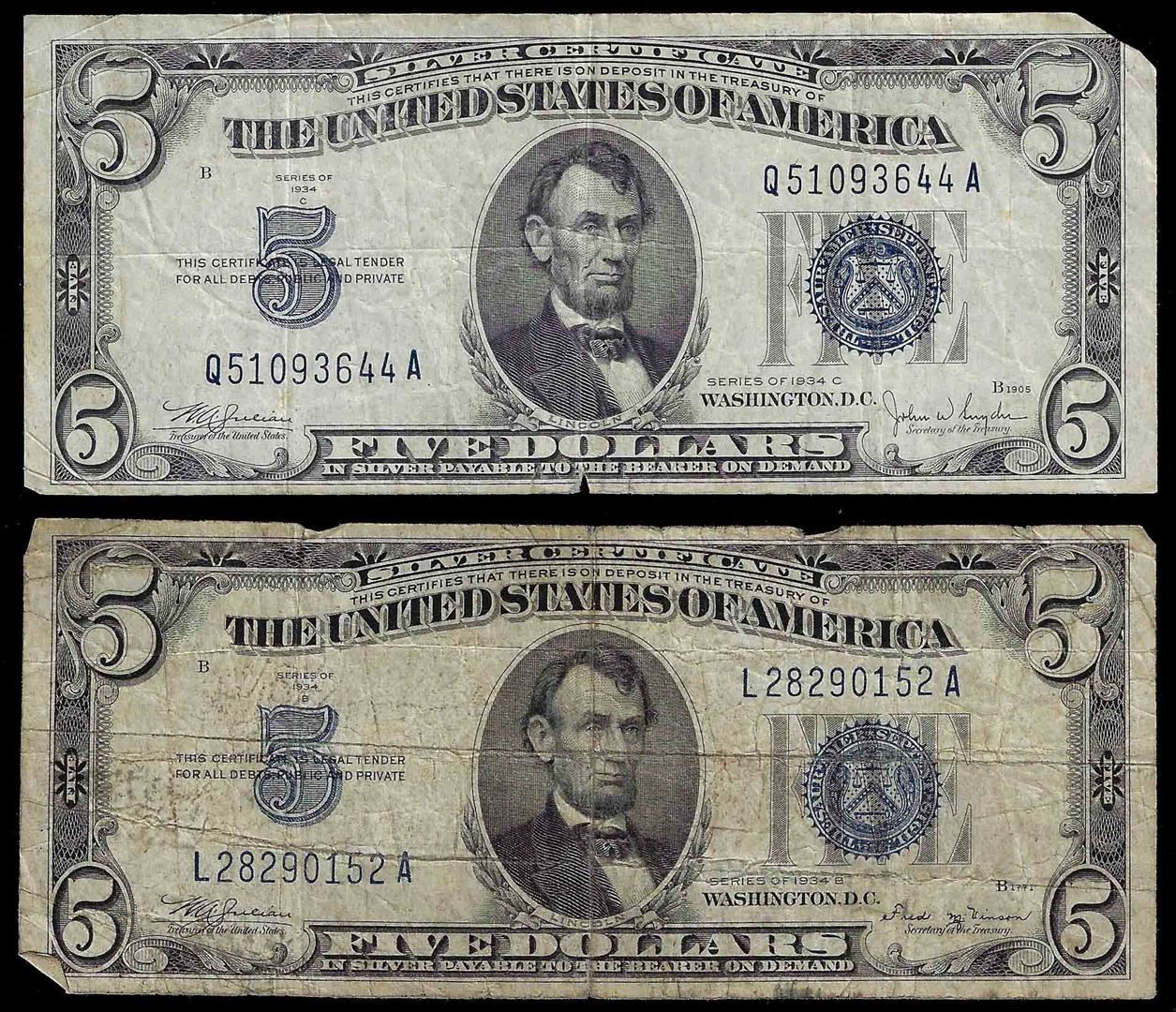 One Lot of (2) 1934 $5 Silver Certificate Notes.