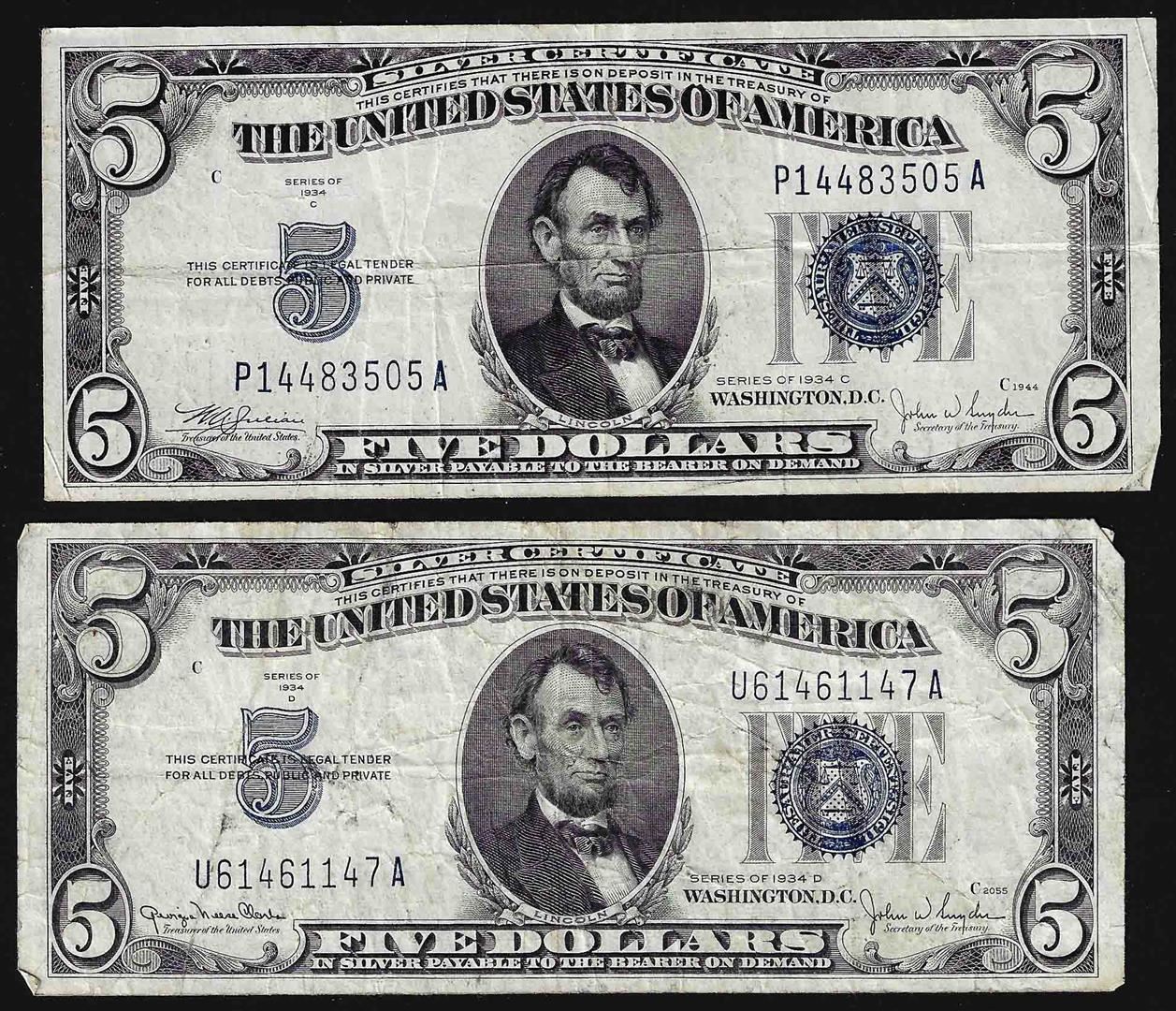One Lot of (2) 1934 $5 Silver Certificate Notes.