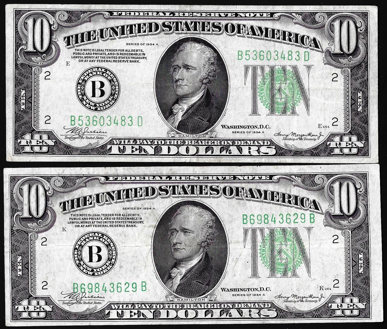 One Lot of (2) 1934A $10 Federal Reserve Notes New York.