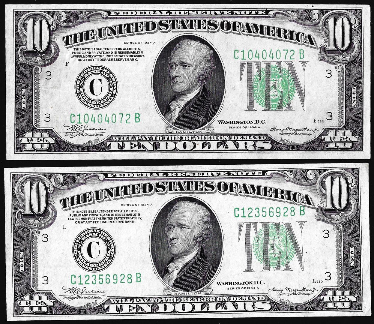 One Lot of (2) 1934A $10 Federal Reserve Notes Philadelphia.