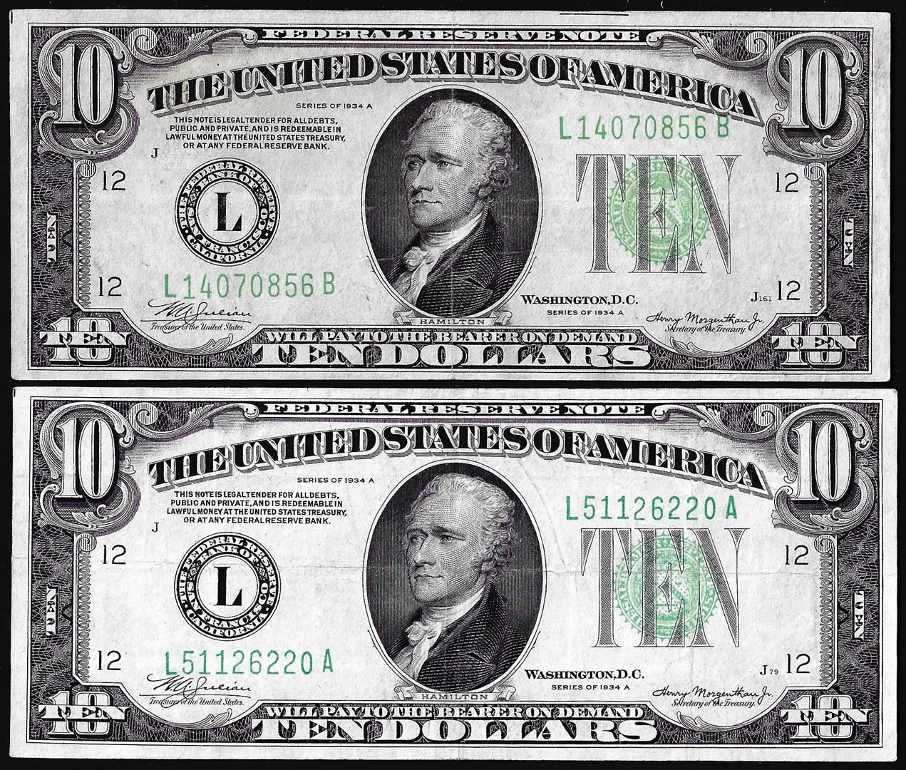 One Lot of (2) 1934A $10 Federal Reserve Notes San Francisco.