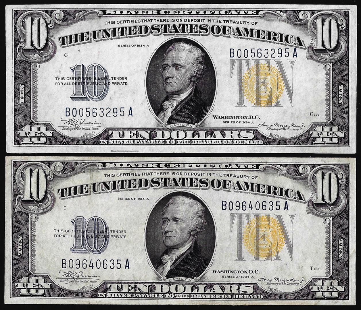 Lot of (2) 1934A $10 North Africa WWII Emergency Issue Silver Certificate Notes