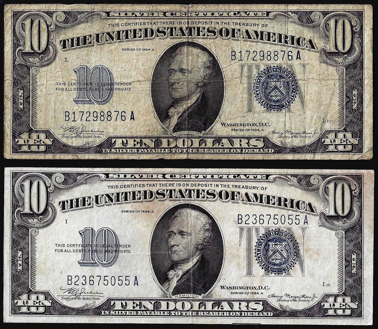 One Lot of (2) 1934A $10 Silver Certificate Notes.