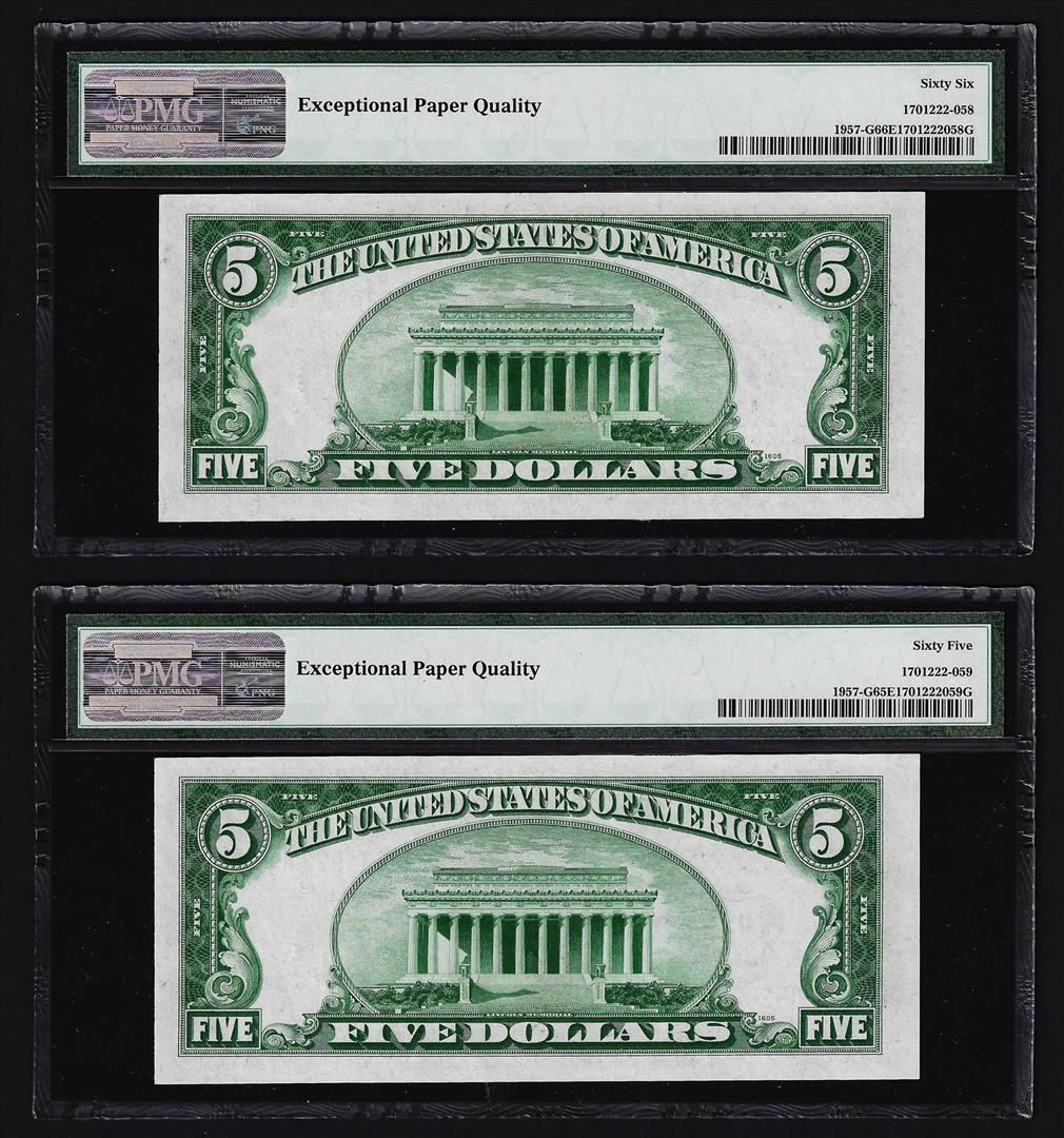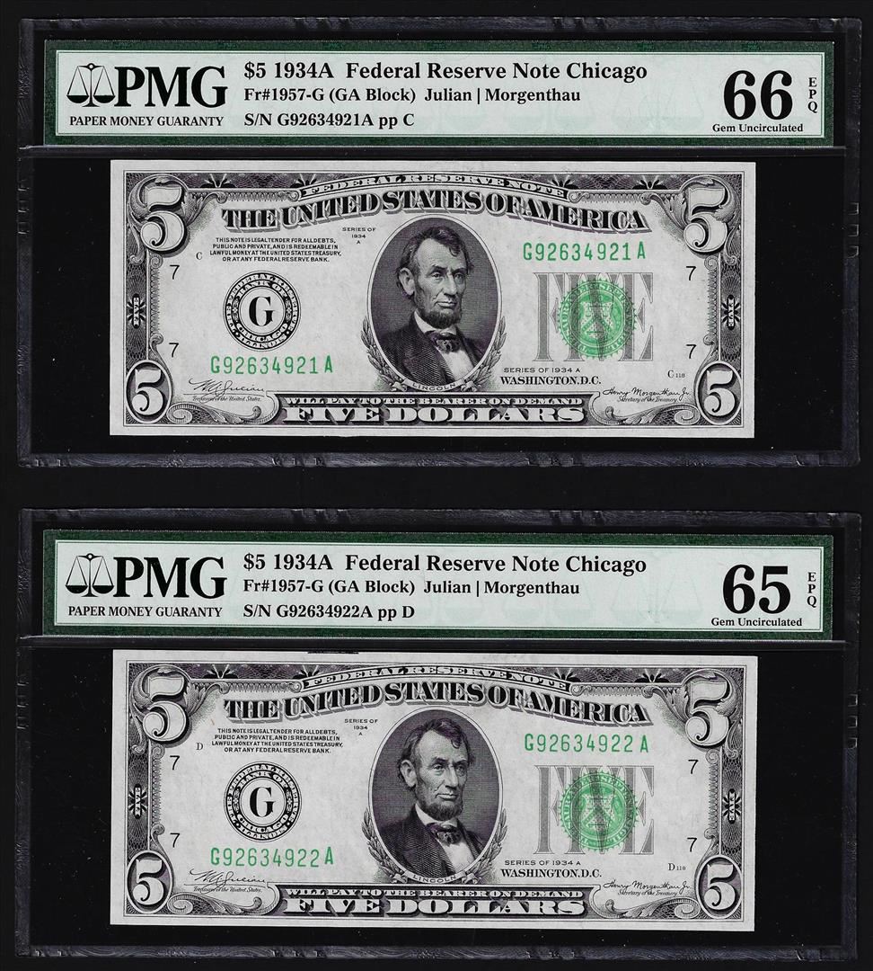Lot of (2) 1934A $5 Federal Reserve Notes Chicago PMG 65EPQ & 66EPQ
