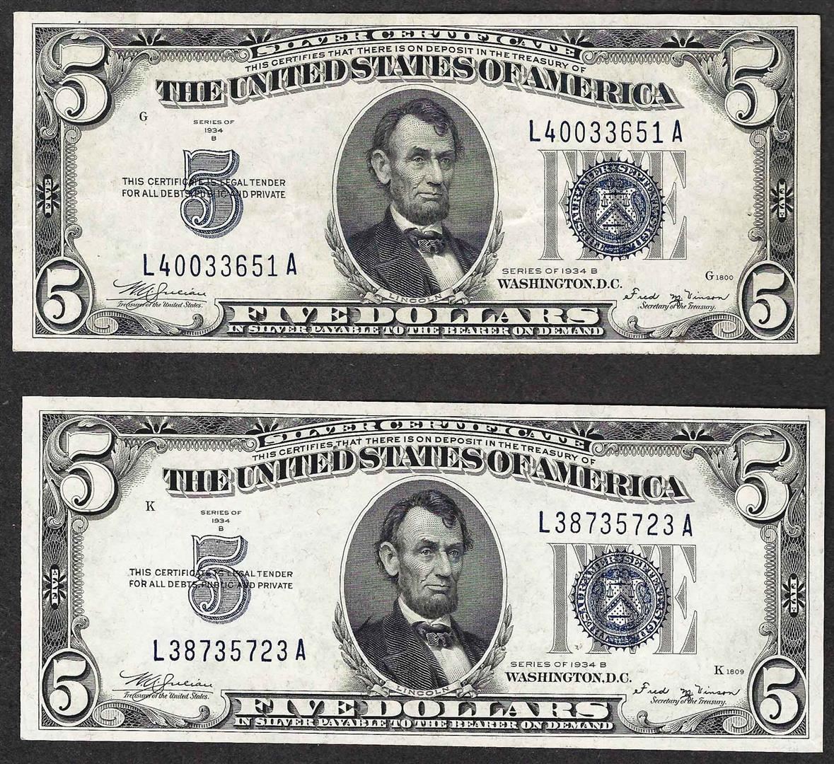 One Lot of (2) 1934B $5 Silver Certificate Notes.