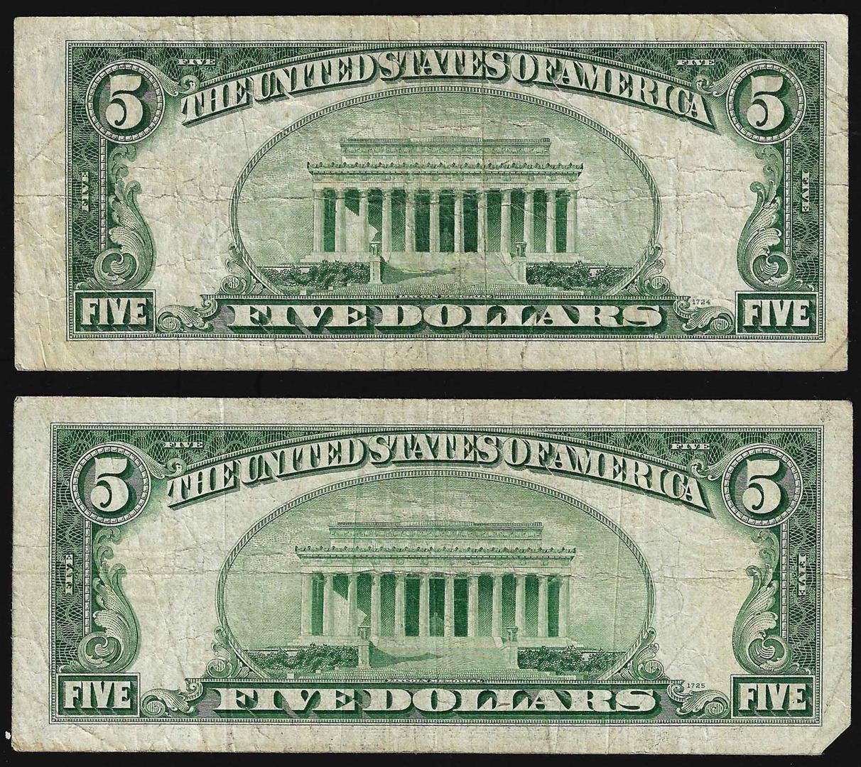 One Lot of (2) 1934C $5 Silver Certificate Notes.