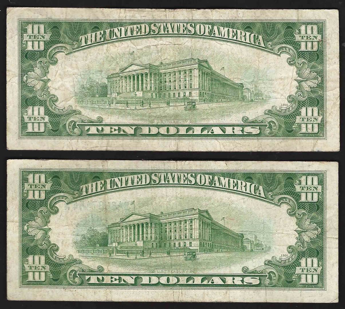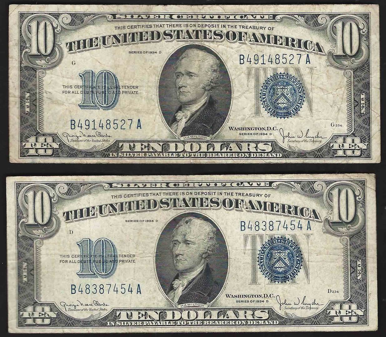 One Lot of (2) 1934D $10 Silver Certificate Notes.