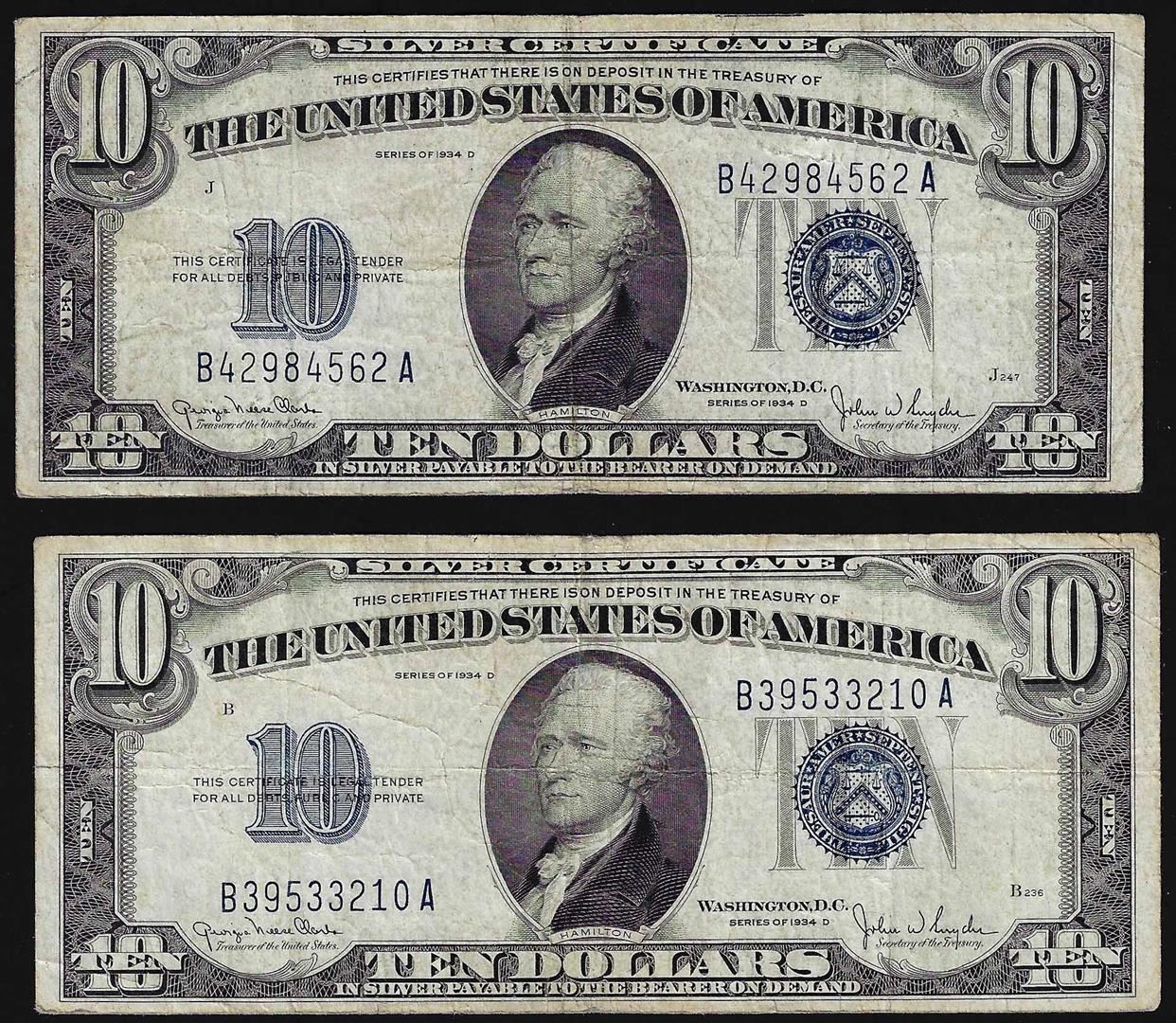 One Lot of (2) 1934D $10 Silver Certificate Notes.