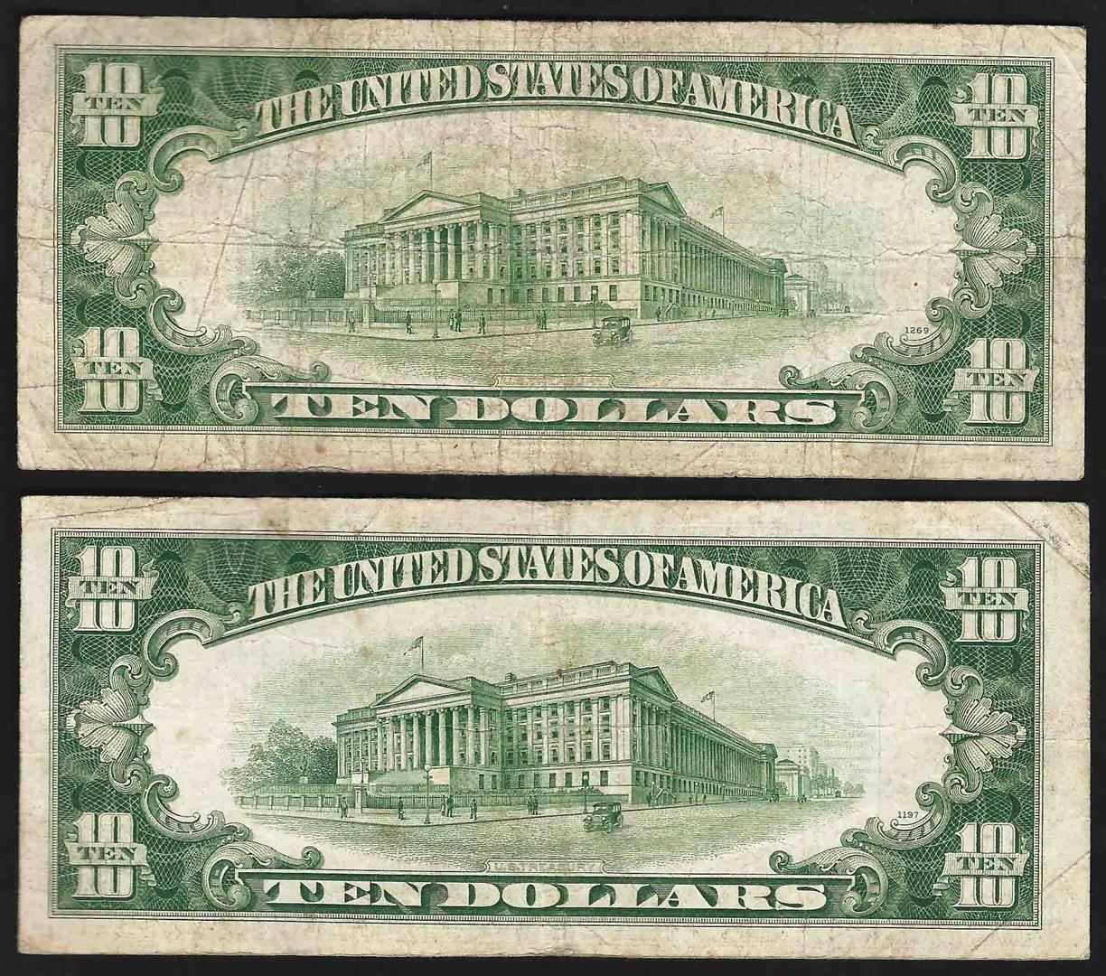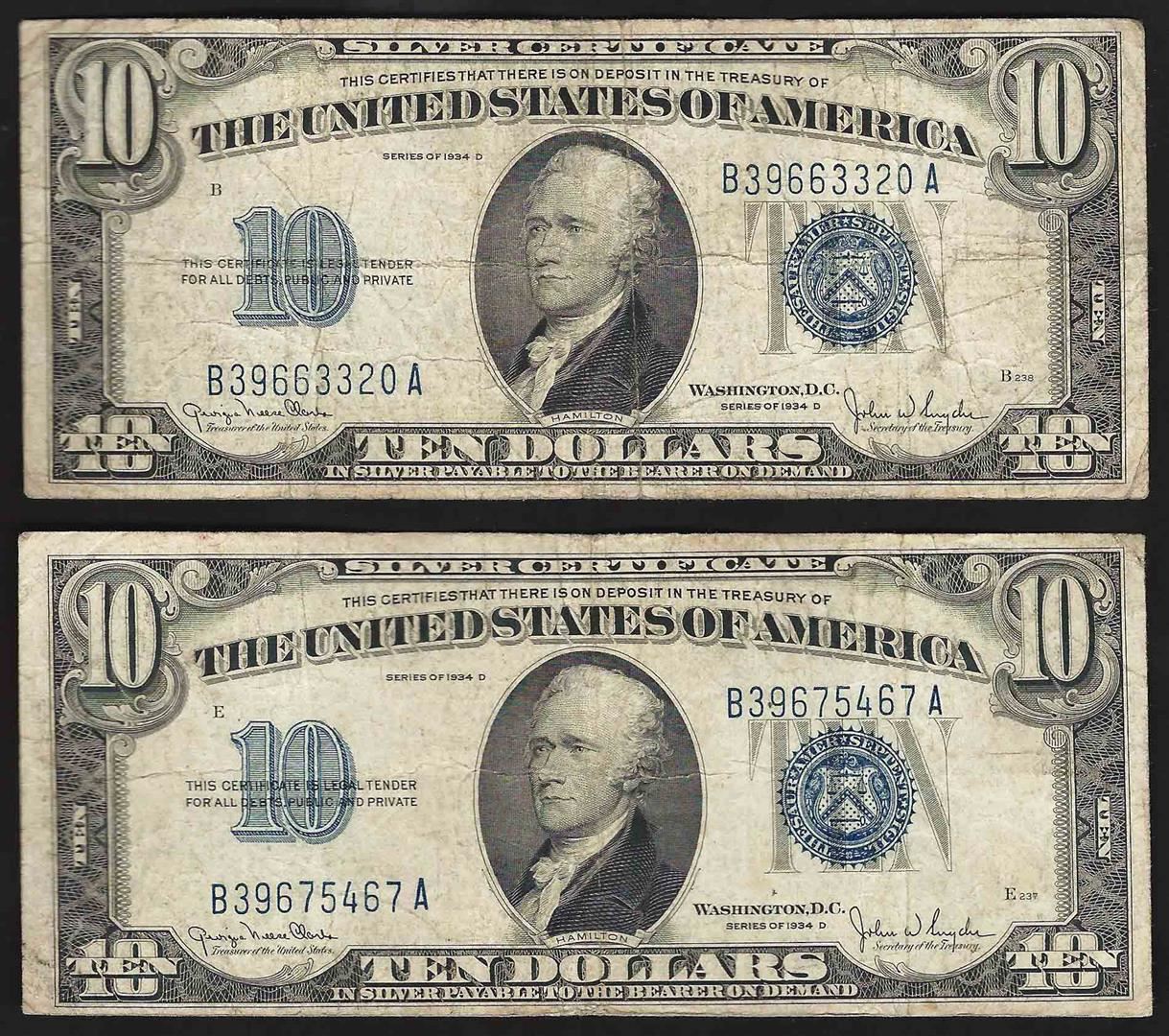 One Lot of (2) 1934D $10 Silver Certificate Notes.