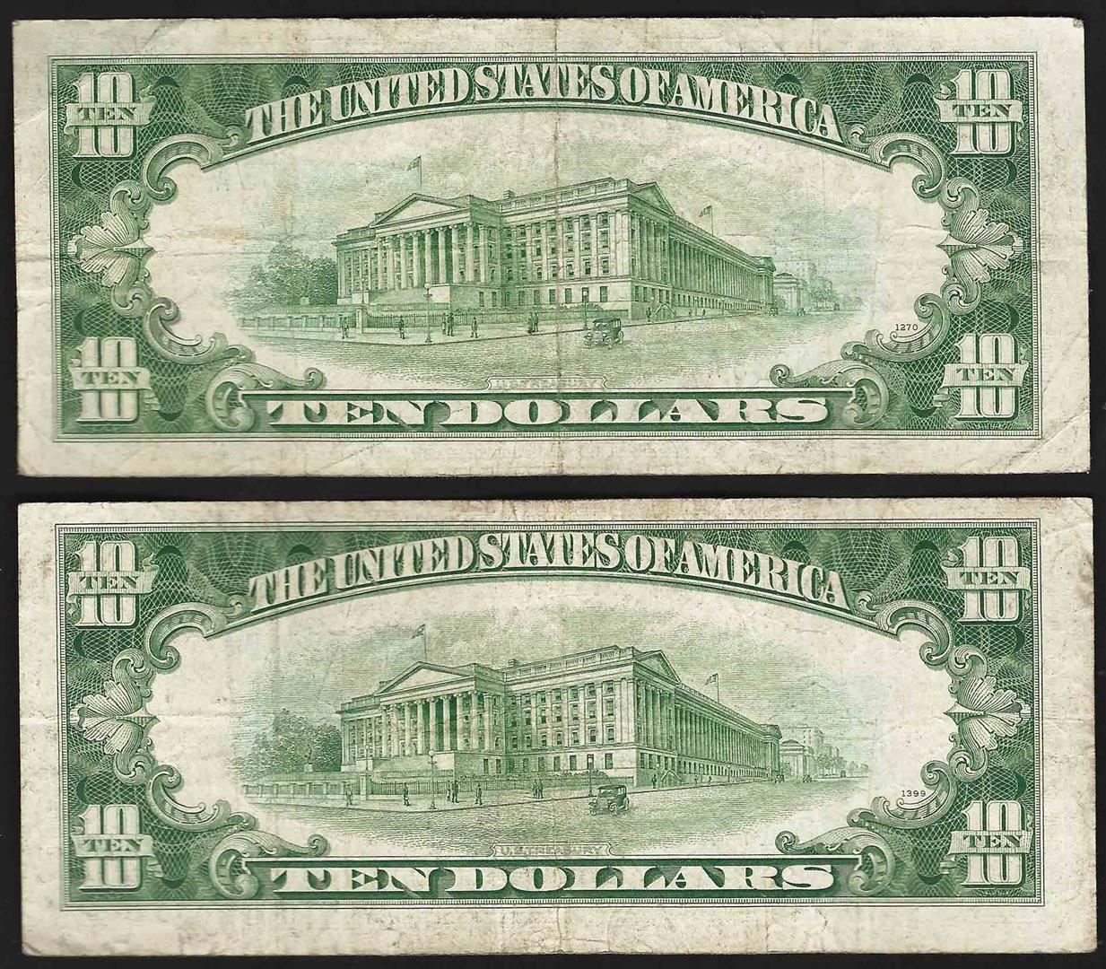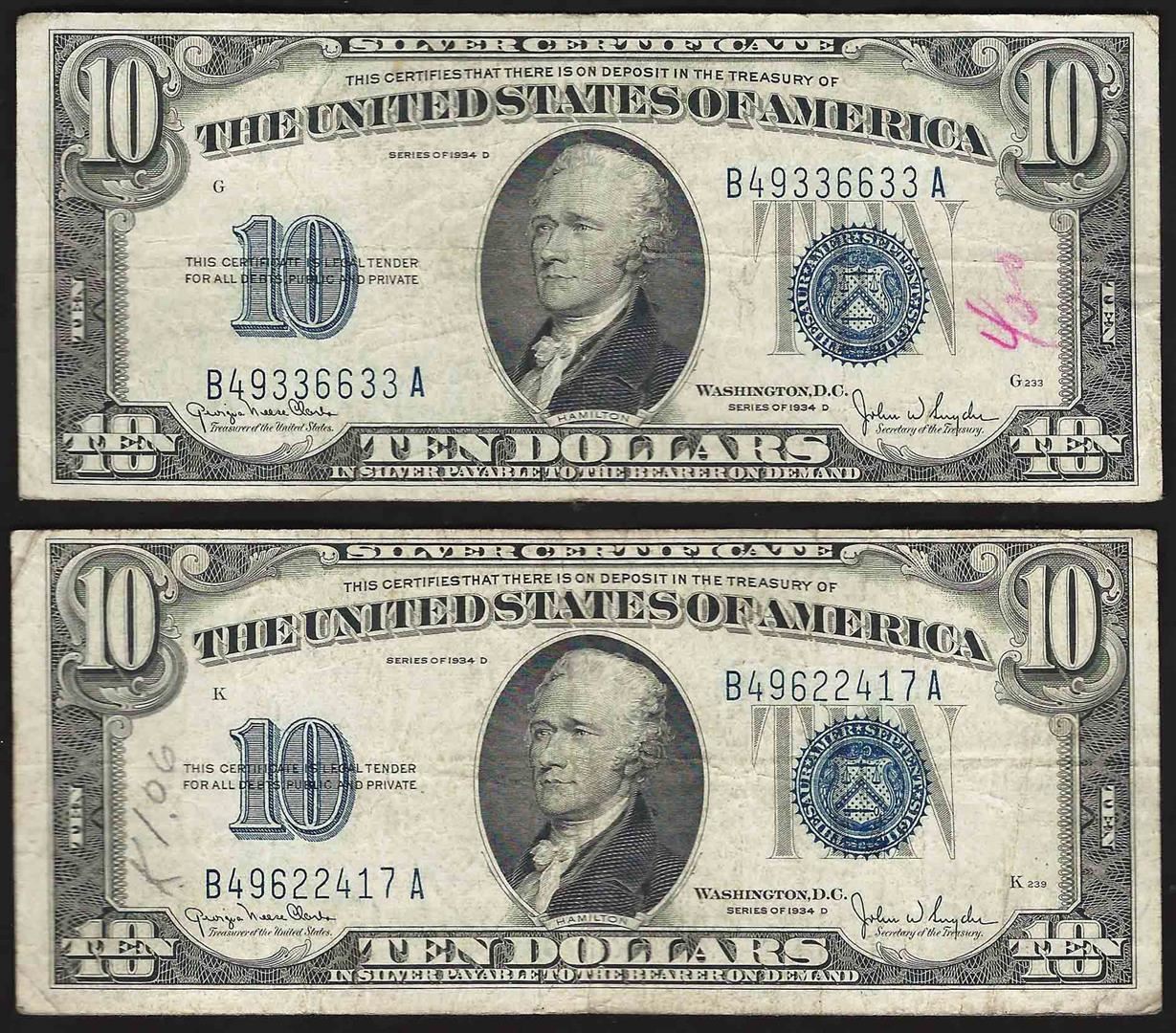 One Lot of (2) 1934D $10 Silver Certificate Notes.