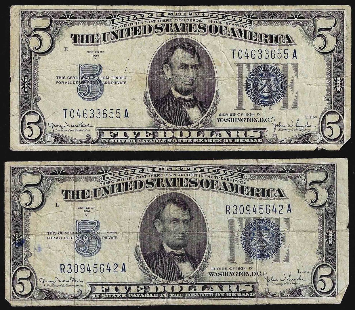 One Lot of (2) 1934D $5 Silver Certificate Notes.