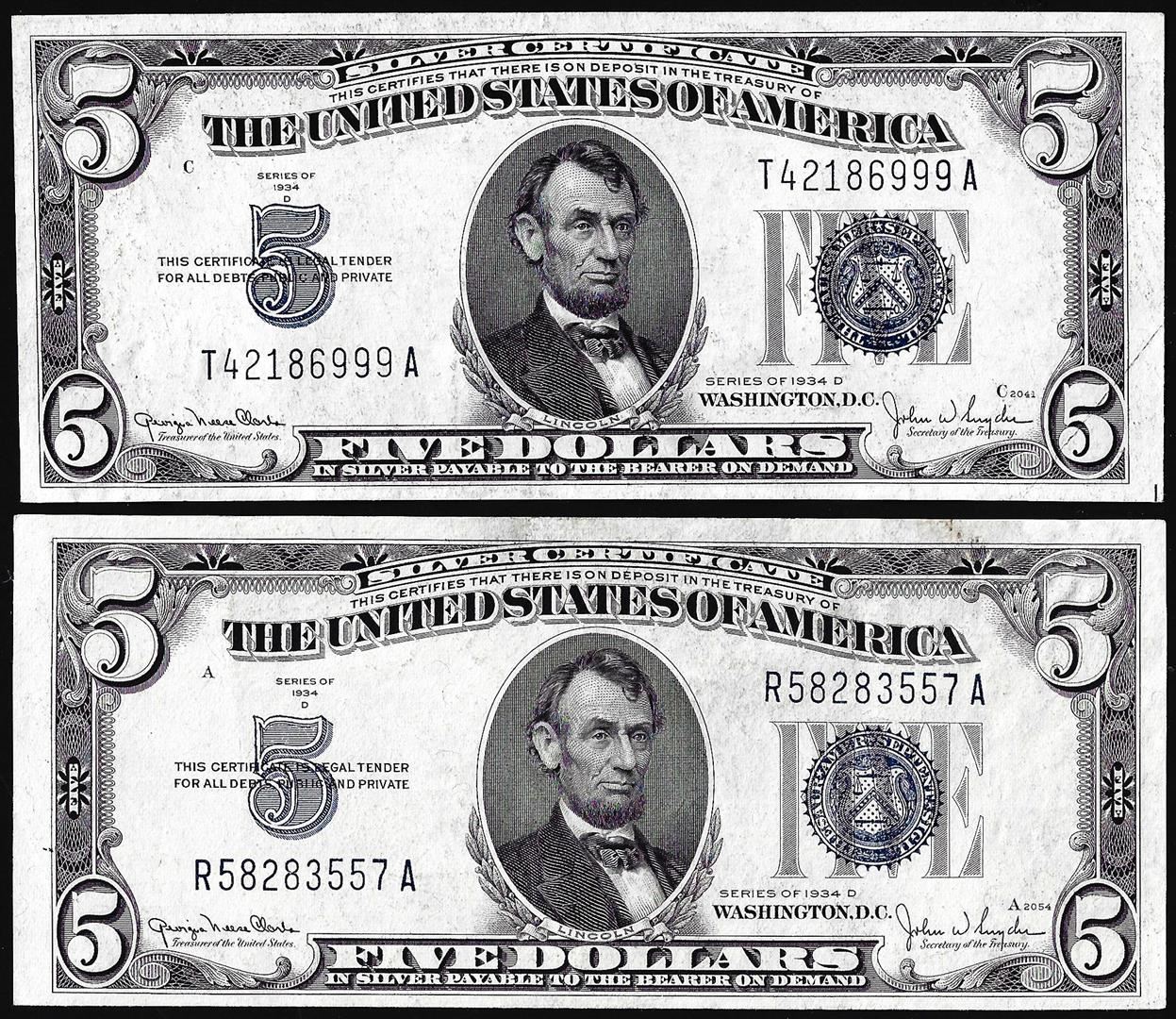 One Lot of (2) 1934D $5 Silver Certificate Notes.