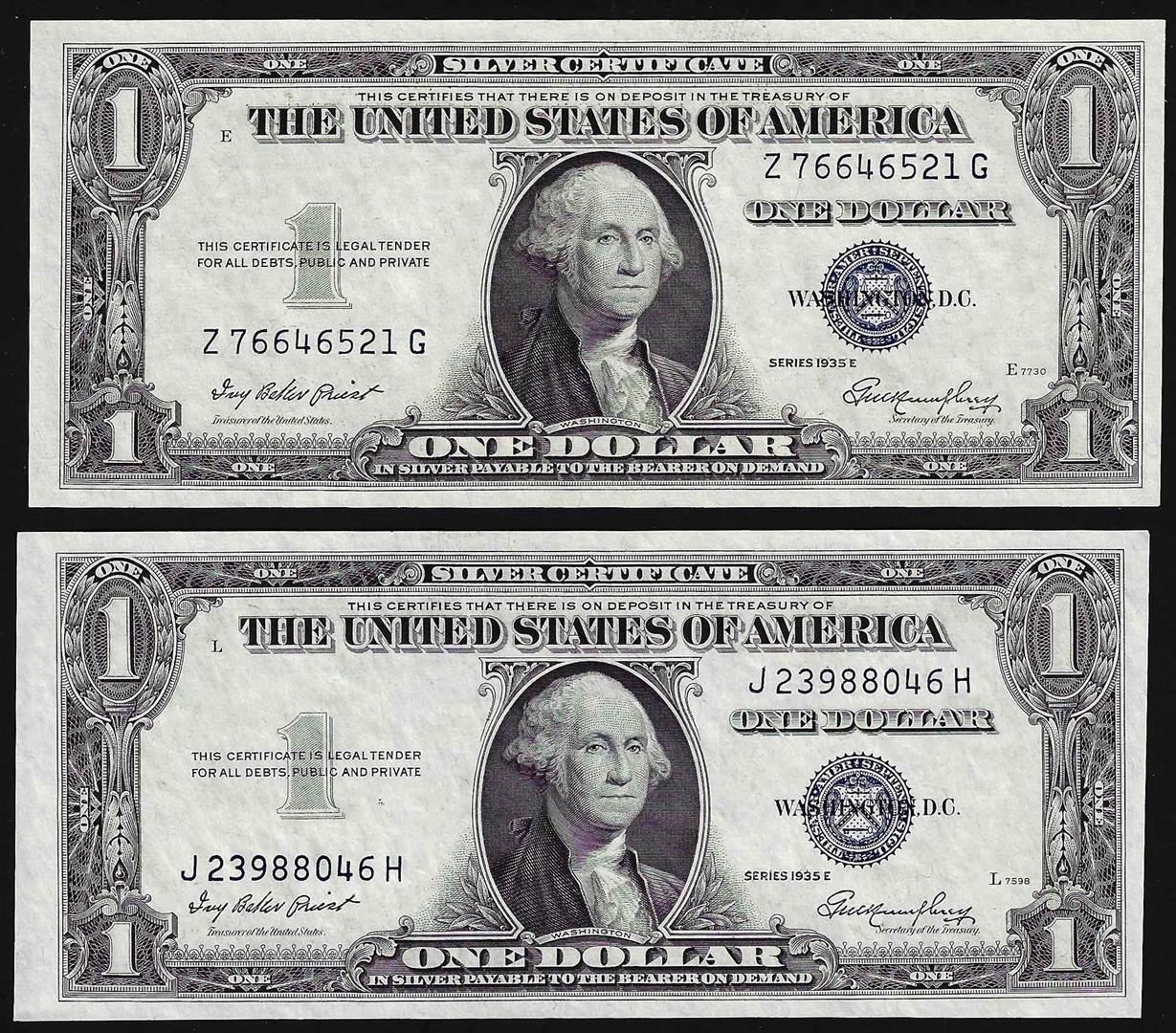 One Lot of (2) 1935E $1 Silver Certificate Notes Uncirculated.