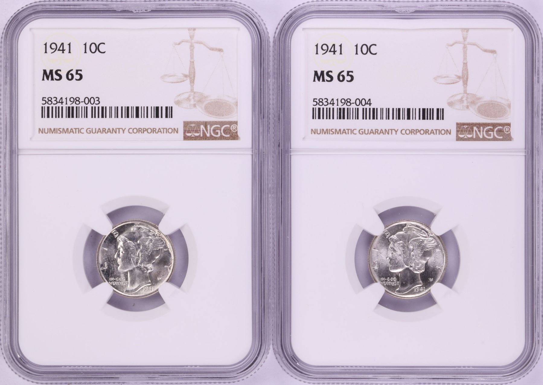 One Lot of (2) 1941 Mercury Dime Coins NGC MS65.