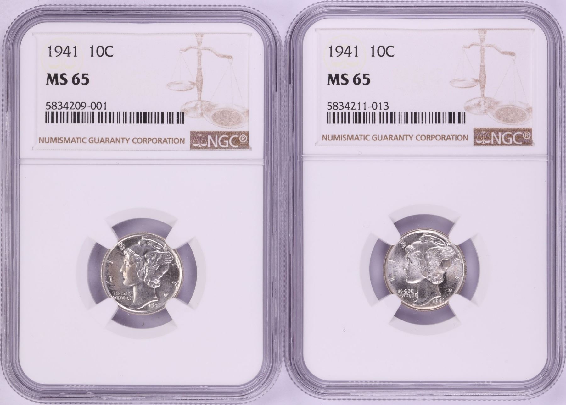 One Lot of (2) 1941 Mercury Dime Coins NGC MS65.