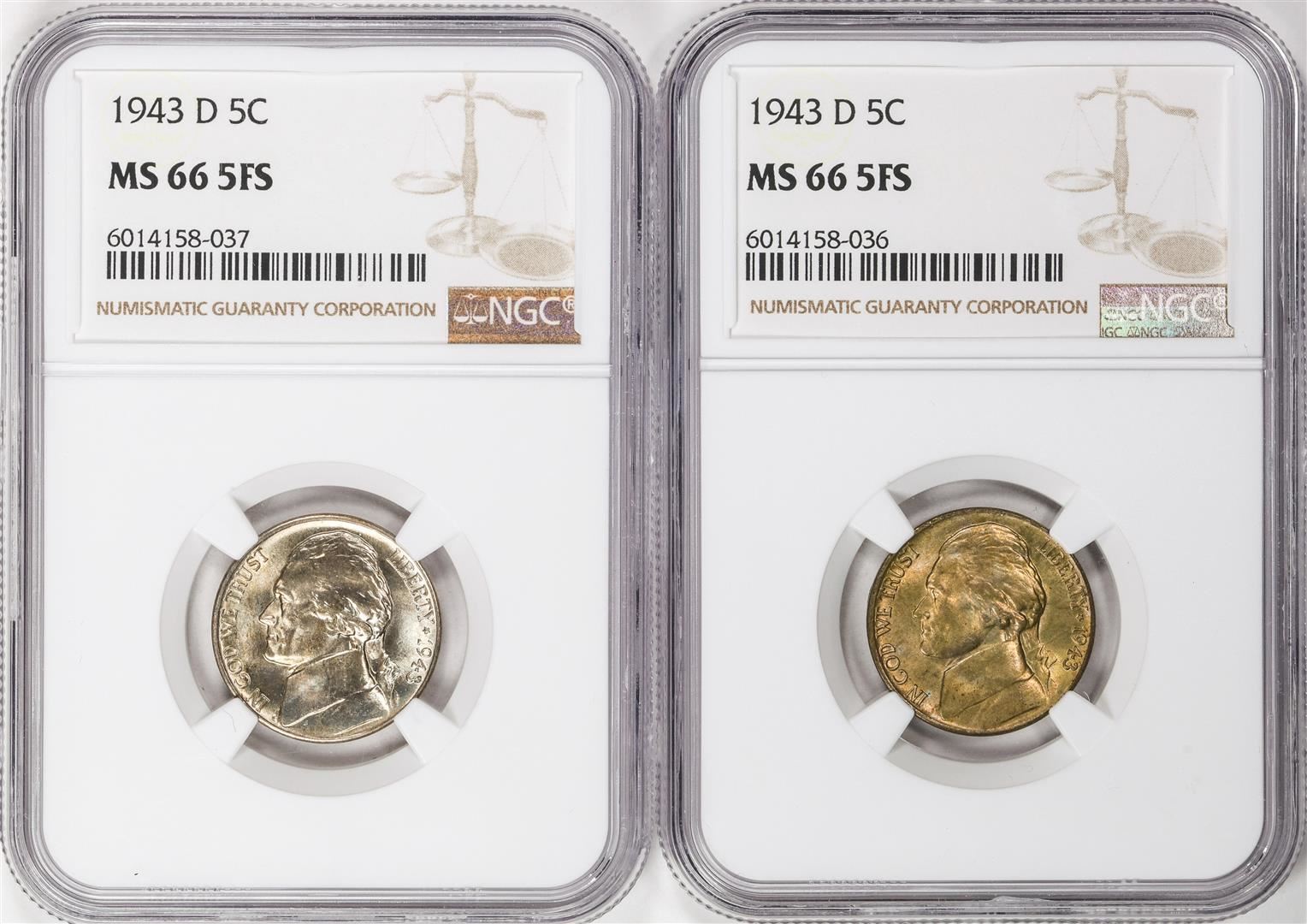 One Lot of (2) 1943-D Jefferson Nickel Coins NGC MS66 5FS. NGC Certified.