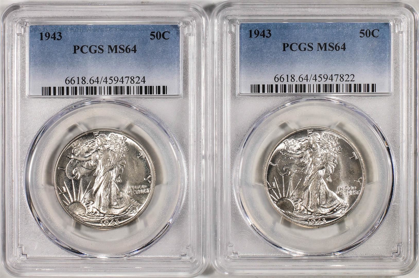 One Lot of (2) 1943 Walking Liberty Half Dollar Coins PCGS MS64. PCGS Graded.