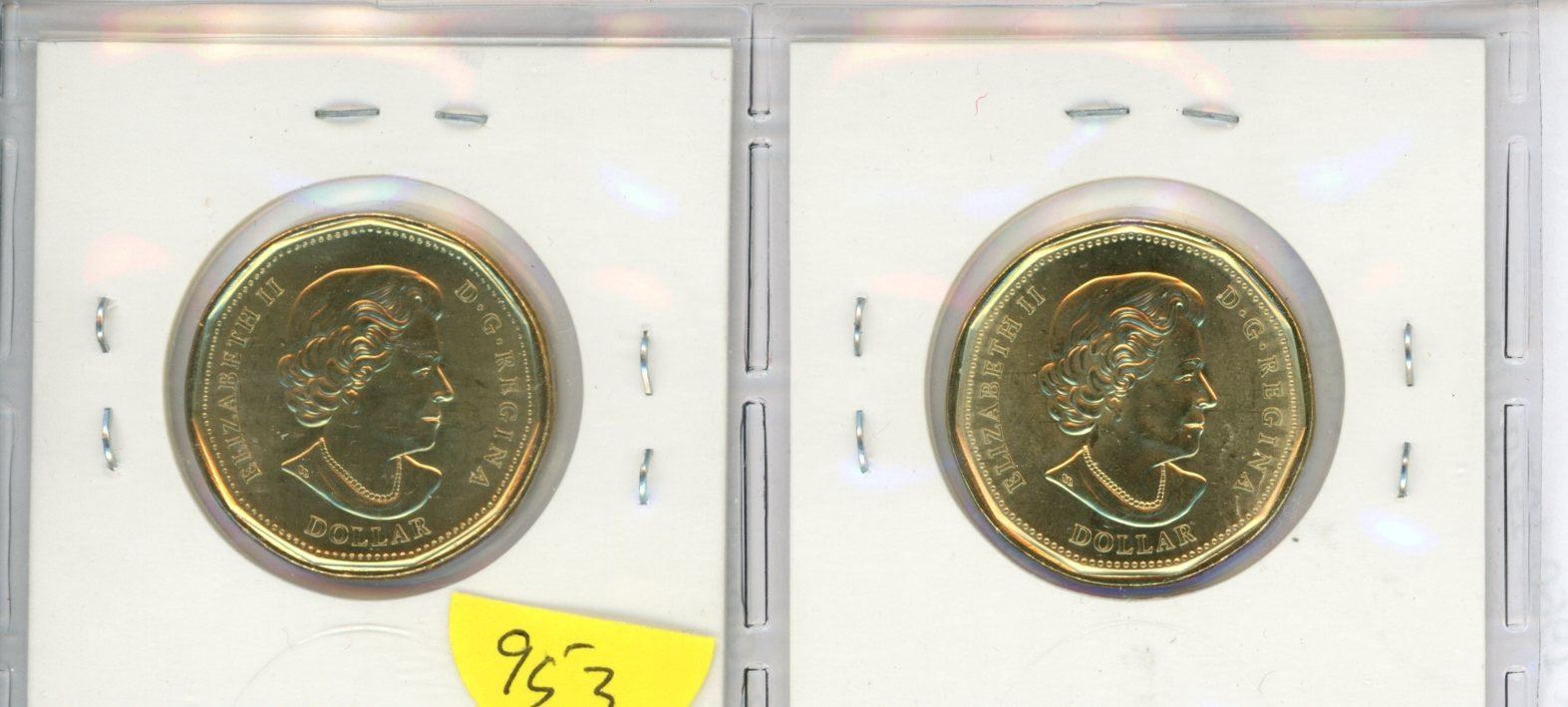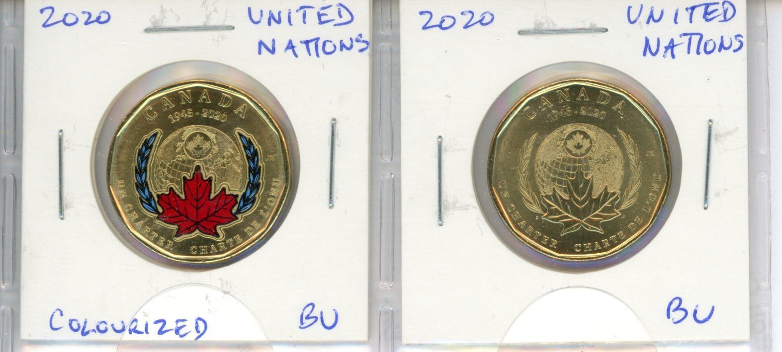 Lot of 2 1945 – 2020 United Nations Loon Dollars. Includes Colourized and uncolourized versions. Both are BU from an original Mint roll.