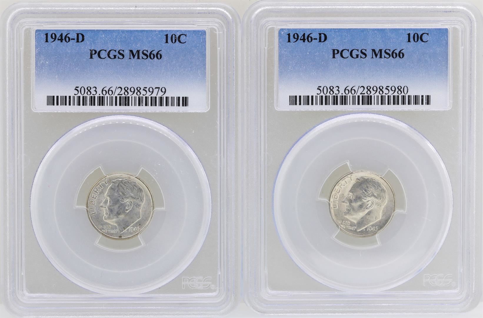 One Lot of (2) 1946-D Roosevelt Dime Coins PCGS MS66. PCGS Certified.