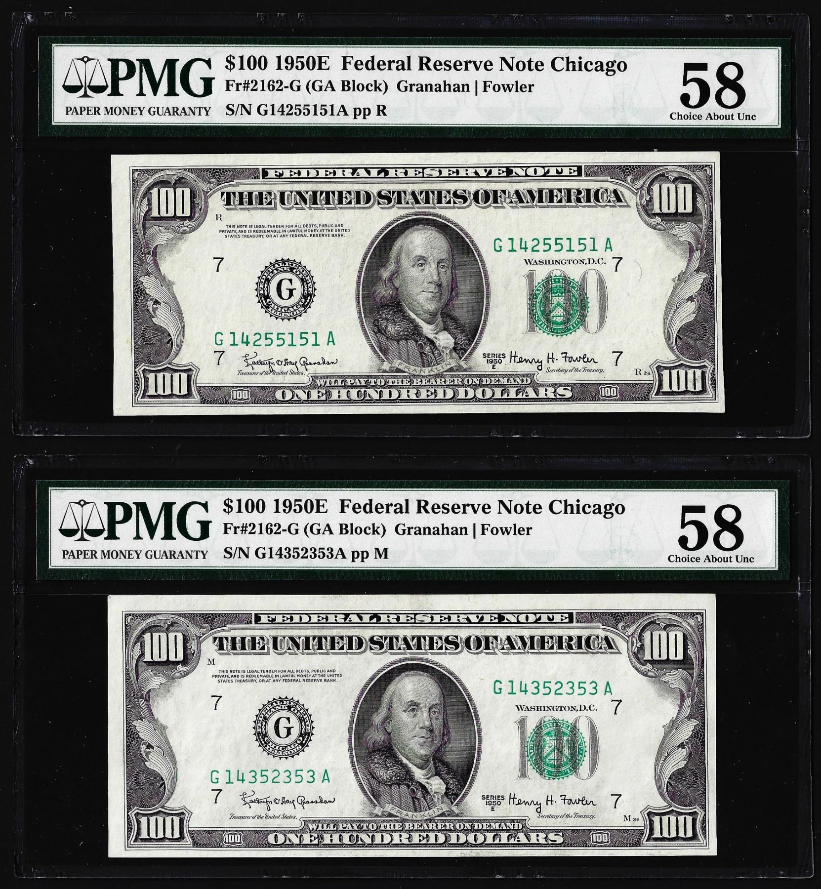 One Lot of (2) 1950E $100 Federal Reserve Notes Chicago PMG Choice About Uncirculated 58.
