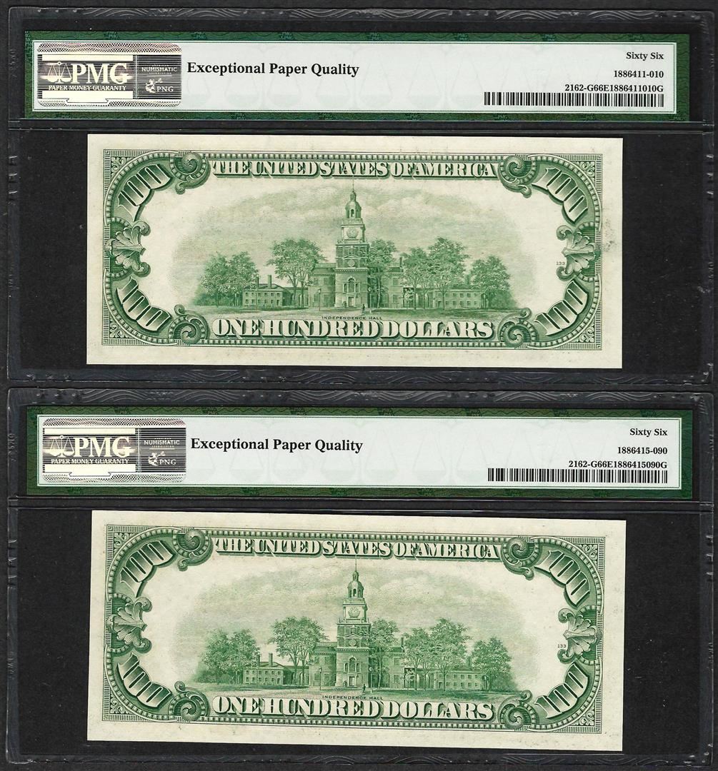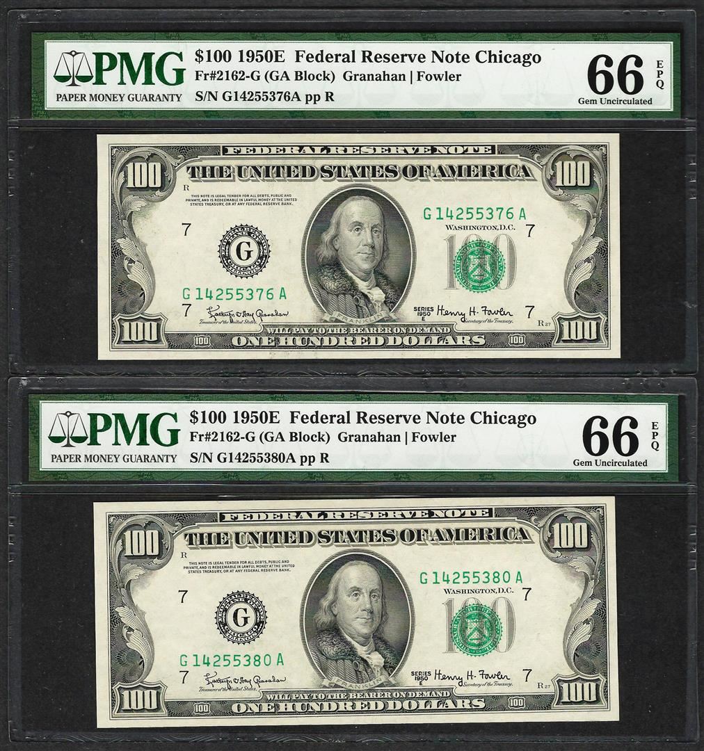 One Lot of (2) 1950E $100 Federal Reserve Notes Chicago PMG Gem Uncirculated 66EPQ. PMG Certified.