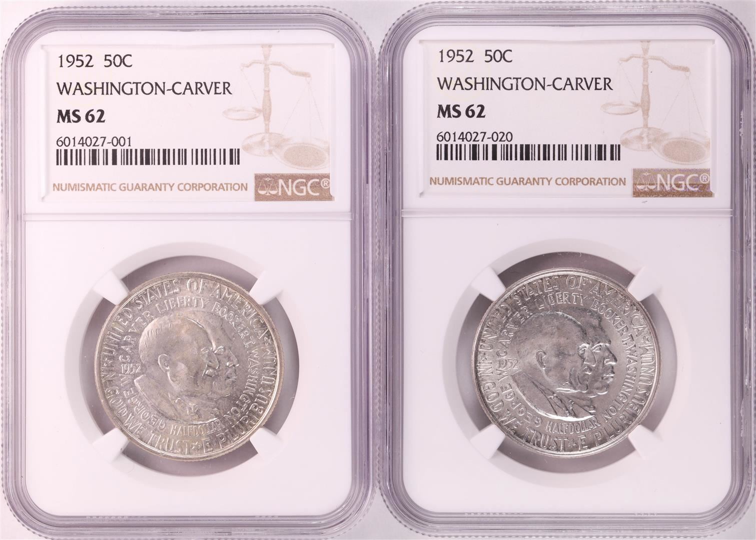 One Lot of (2) 1952 Washington-Carver Commemorative Half Dollar Coins NGC MS62. NGC Certified.