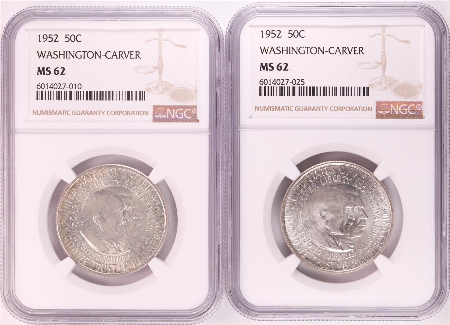 One Lot of (2) 1952 Washington-Carver Commemorative Half Dollar Coins NGC MS62. NGC Certified.