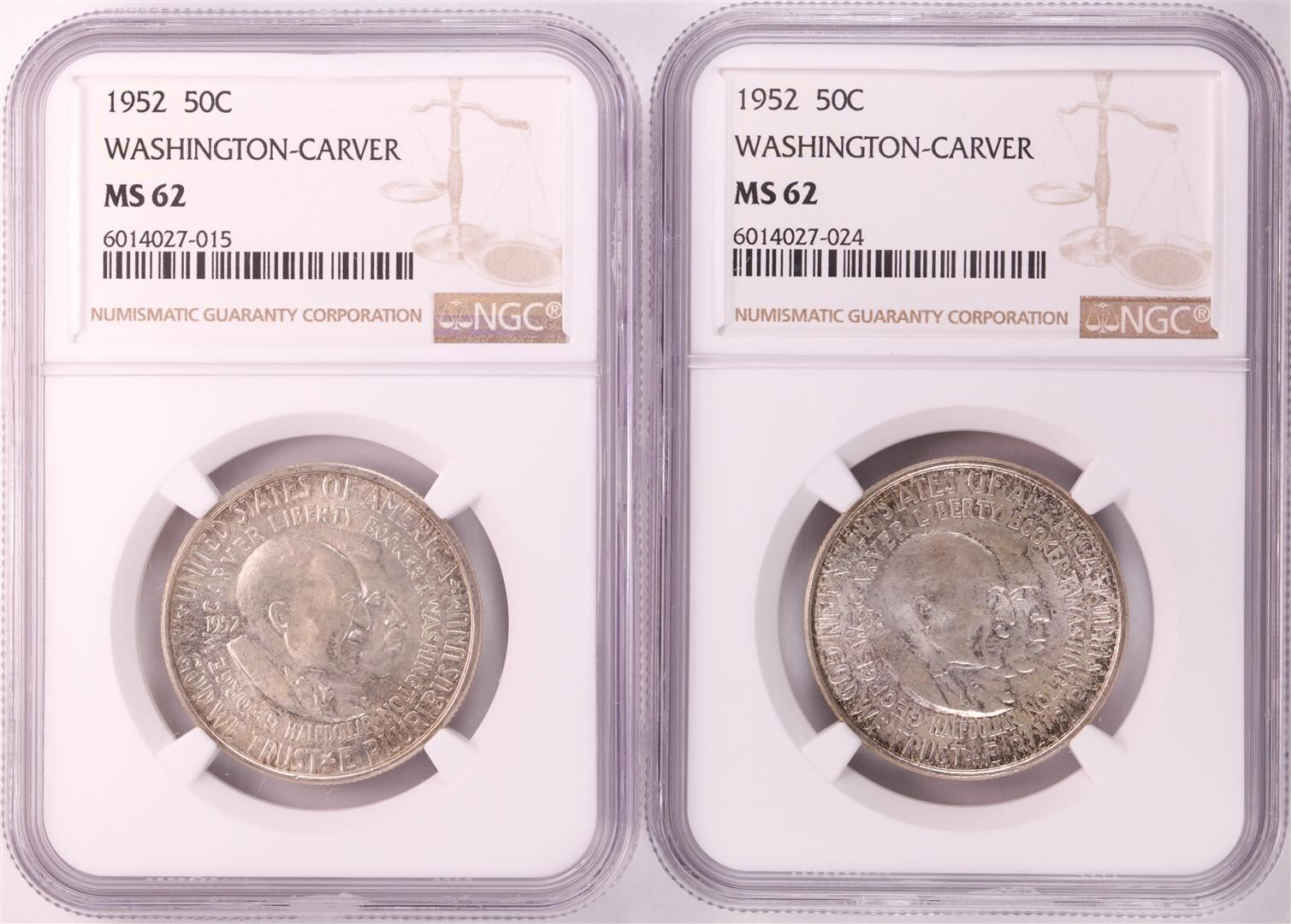 One Lot of (2) 1952 Washington-Carver Commemorative Half Dollar Coins NGC MS62. NGC Certified.