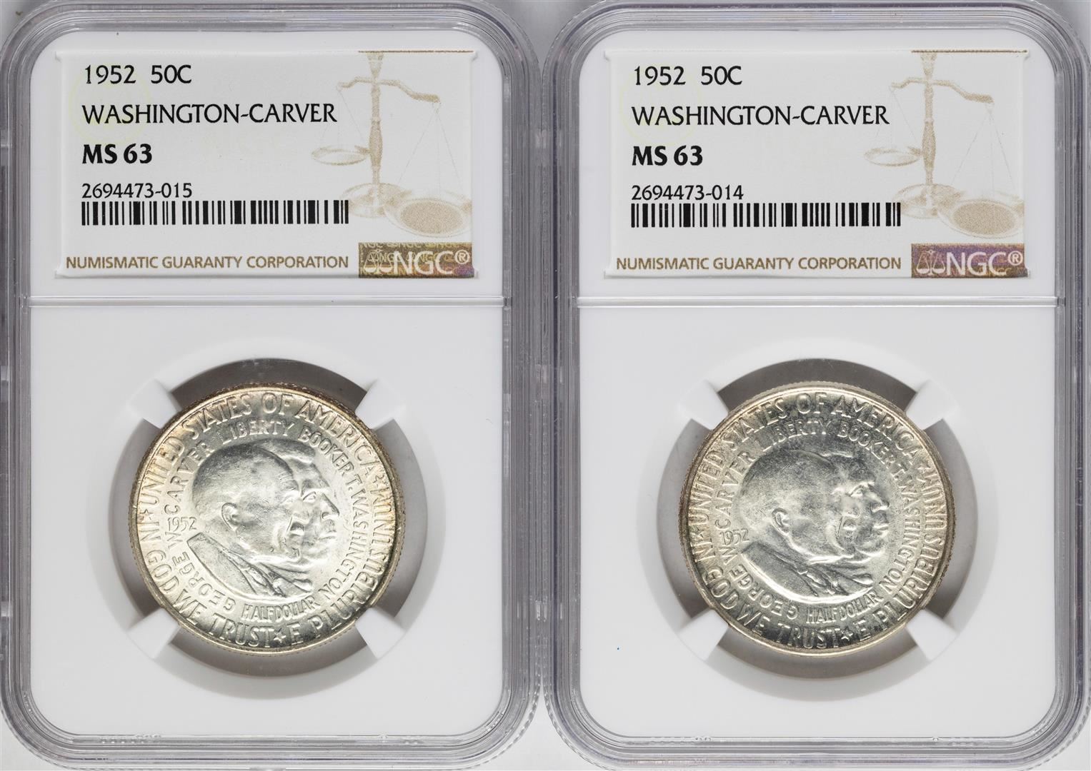One Lot of (2) 1952 Washington-Carver Commemorative Half Dollar Coins NGC MS63. NGC Certified.