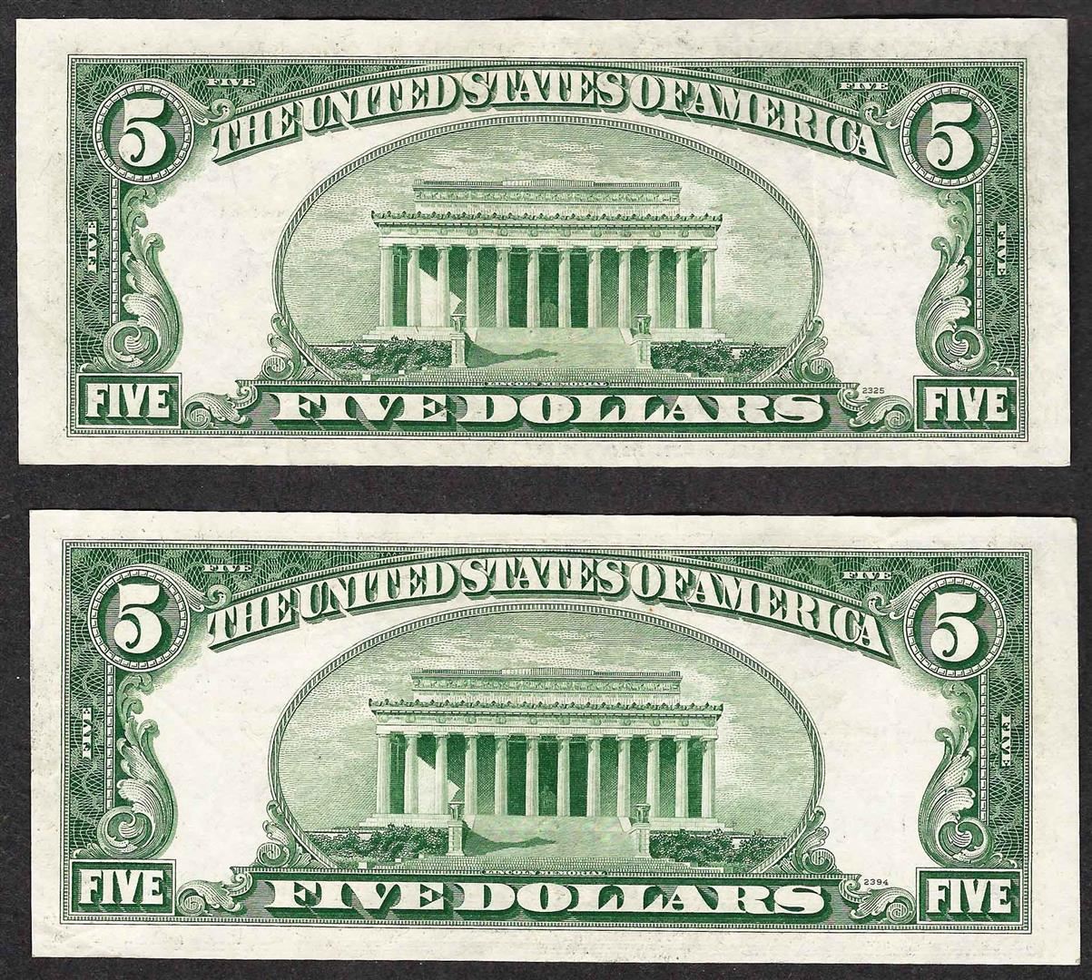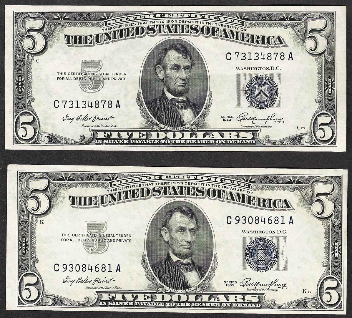 One Lot of (2) 1953 $5 Silver Certificate Notes.