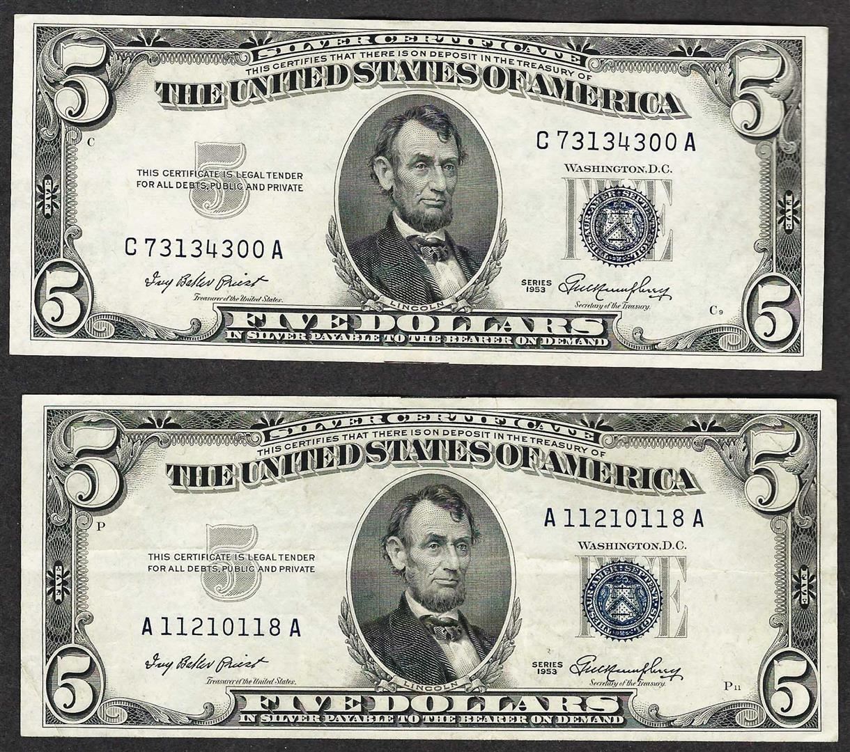 One Lot of (2) 1953 $5 Silver Certificate Notes.