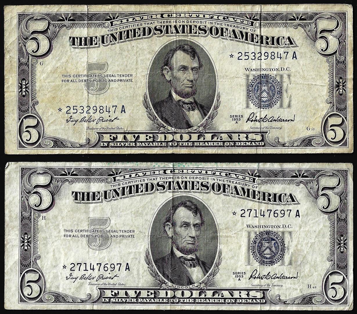 One Lot of (2) 1953A $5 Silver Certificate STAR Notes.