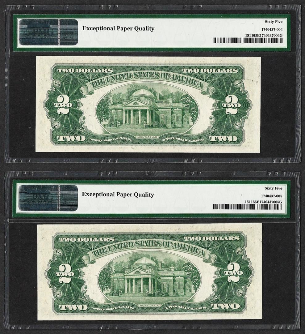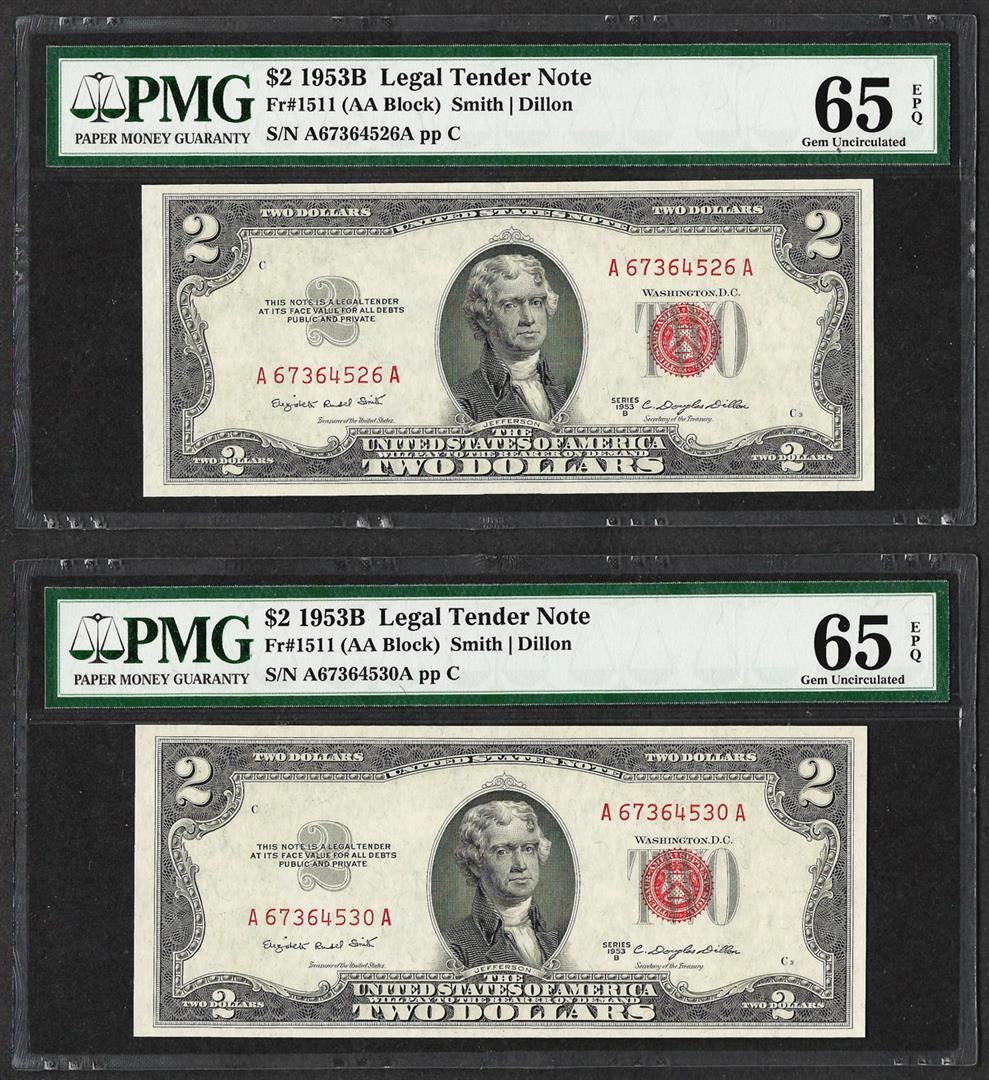 Lot of (2) 1953B $2 Legal Tender Notes Fr.1511 PMG Gem Uncirculated 65EPQ