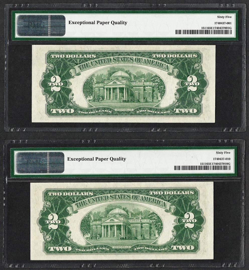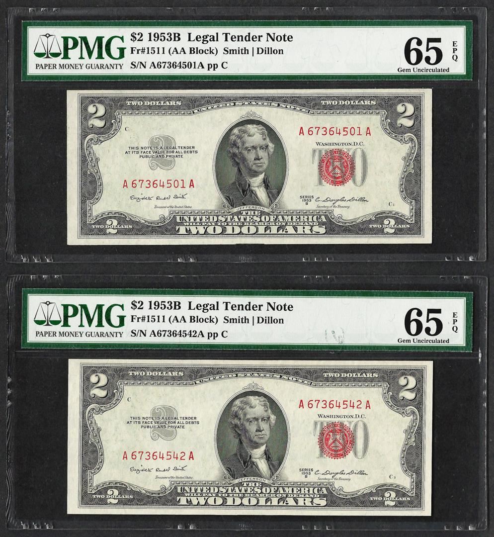 Lot of (2) 1953B $2 Legal Tender Notes Fr.1511 PMG Gem Uncirculated 65EPQ