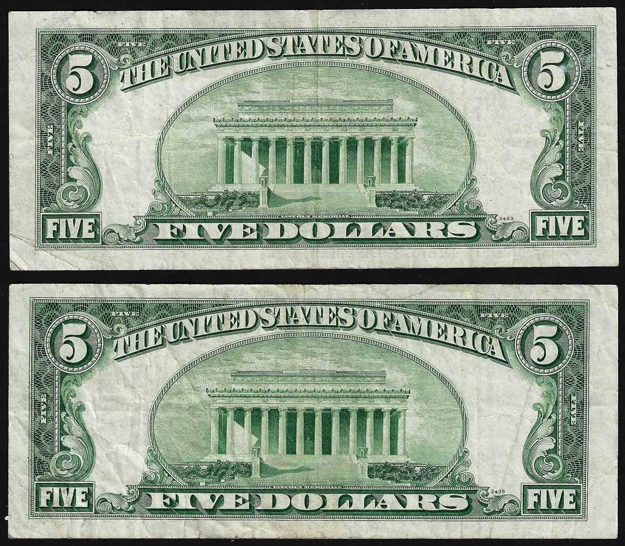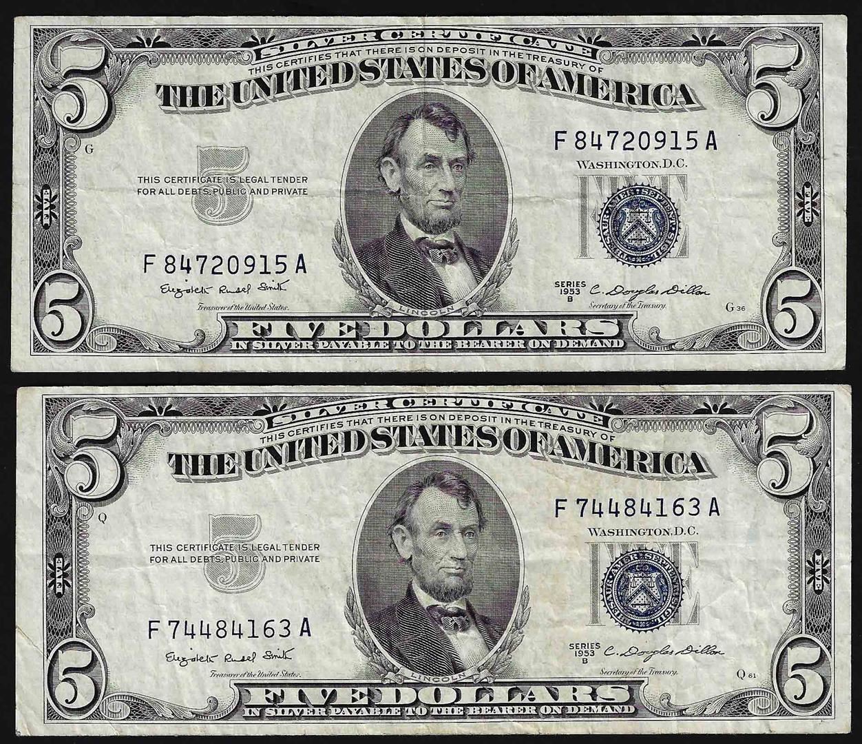 One Lot of (2) 1953B $5 Silver Certificate Notes.