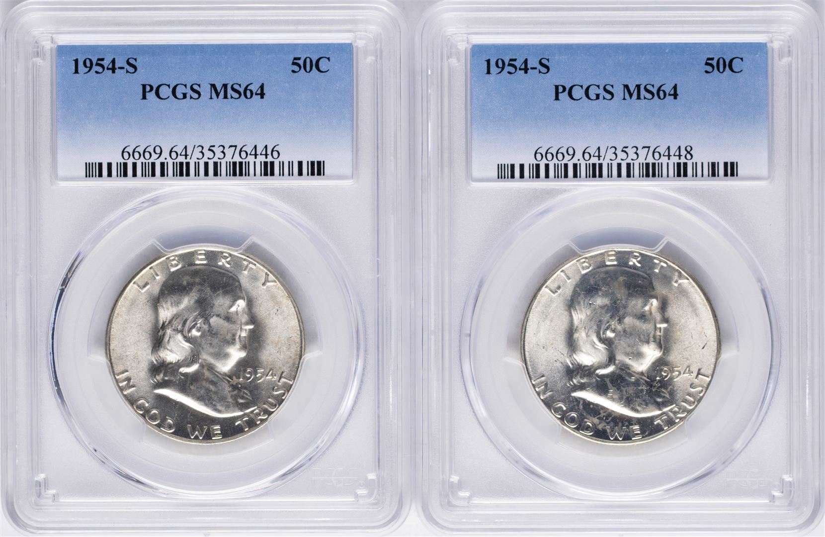 One Lot of (2) 1954-S Franklin Half Dollar Coins PCGS MS64. PCGS Graded.