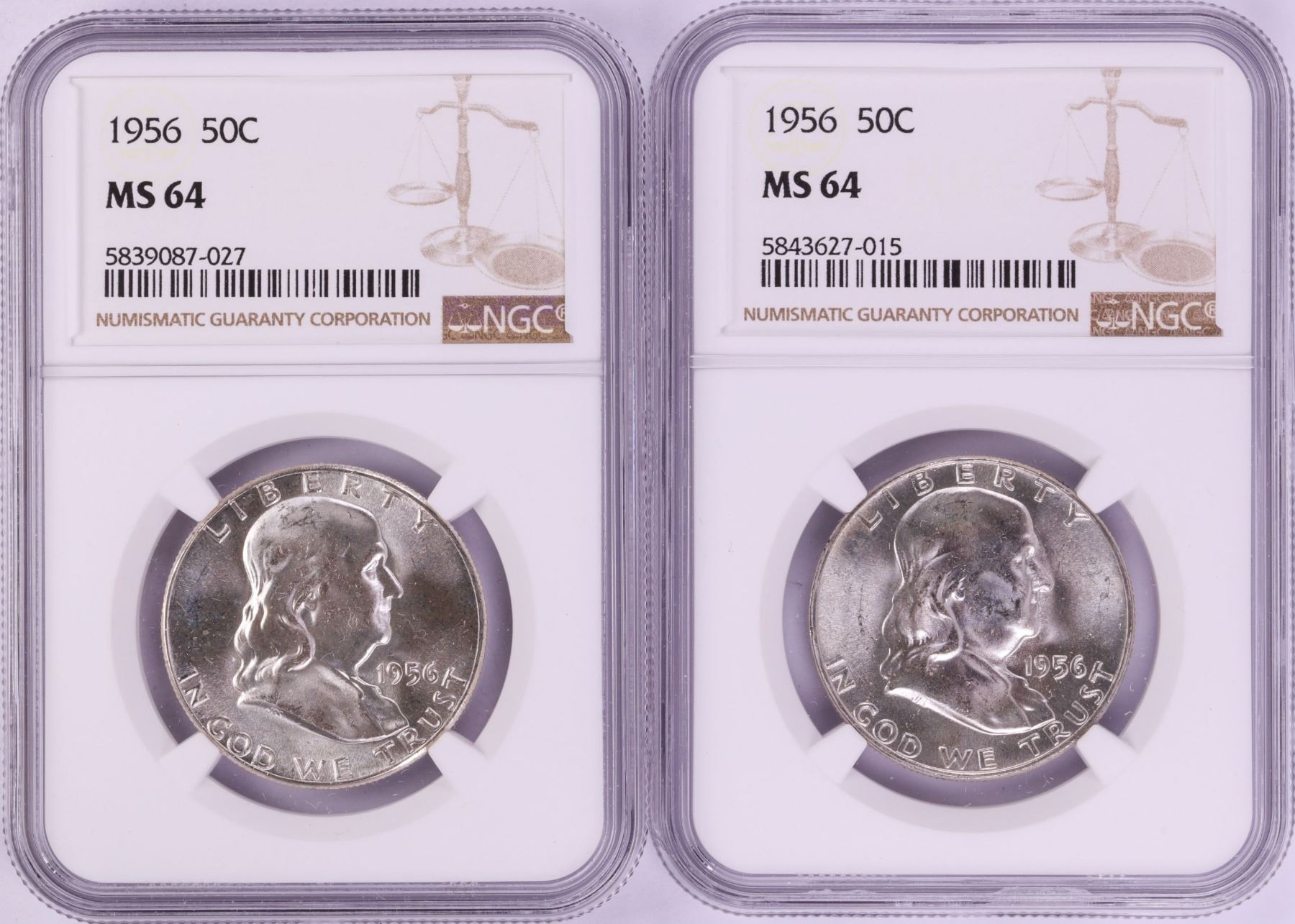 One Lot of (2) 1956 Franklin Half Dollar Coins NGC MS64.