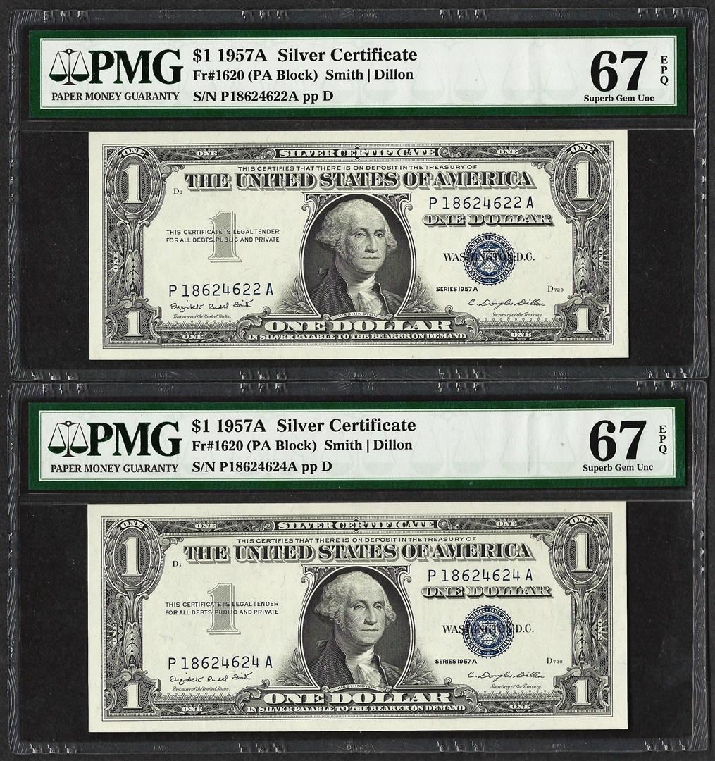 Lot of (2) 1957A $1 Silver Certificate Notes PMG Superb Gem Unc. 67EPQ