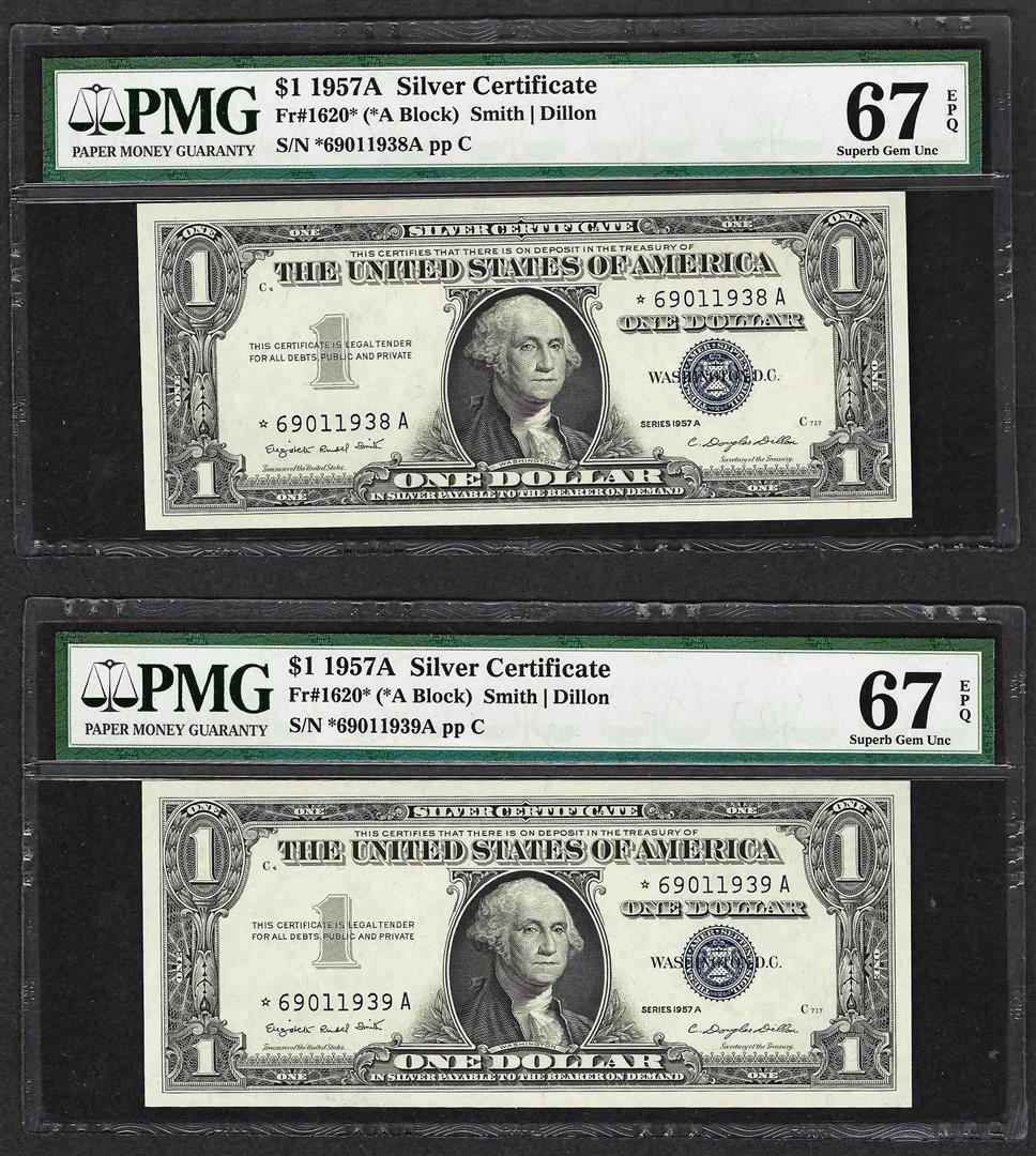 One Lot of (2) 1957A $1 Silver Certificate STAR Notes PMG Superb Gem Uncirculated 67EPQ. PMG Certified.
