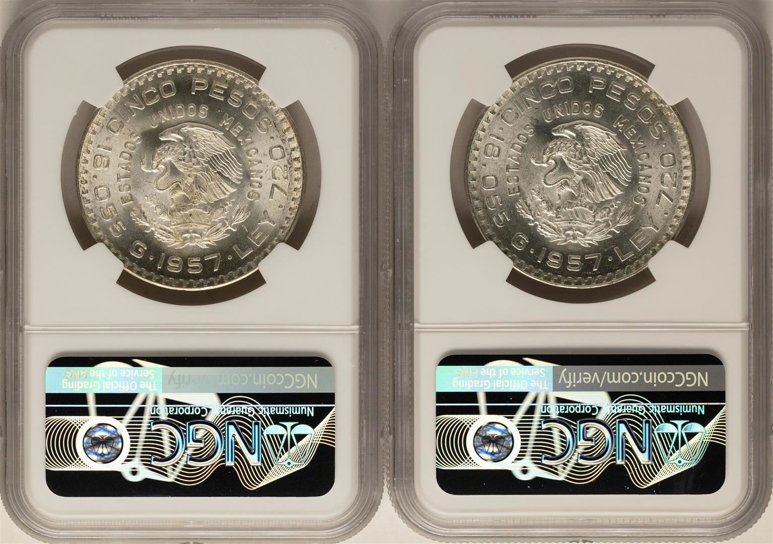 Lot of (2) 1957Mo Mexico 5 Pesos Constitution Centennial Silver Coins NGC MS65